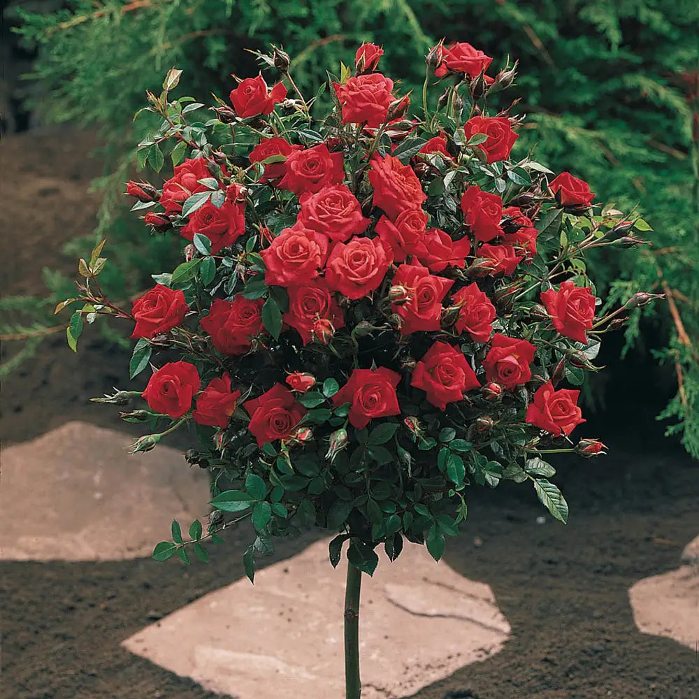 Boasting blooms that are 2-3 times the size of the rose industry's top grade, Firefighter Rose Tree is a true garden standout. The fully double, 4-5" flowers are packed with 40-45 velvety red petals and have a classic hybrid tea form. Plus, Firefighter is a reliable repeat bloomer that delivers 150% more roses in its first year than any other bareroot rose available. Trained as a tree rose, it is densely populated with clean, green foliage and tops a sturdy trunk that keeps the blooms high and visible. PPAF