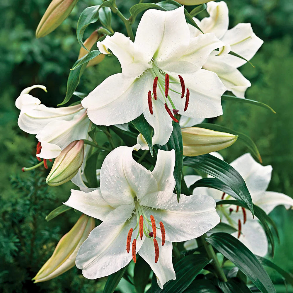Our most finest and popular white Oriental Lily, Casa Blanca features huge, fragrant, white flowers that measure 10-12" across. The flowers are stunning in bouquets and other fresh floral displays. The plants grow up to 48" tall and produce up to eight long-lasting blooms on each stem in late July through early August. In windy locations, the plants may need staking. Over the past few years, the demand and interest in Oriental Lilies has grown dramatically. Oriental Lilies are one of the most beautiful of all lilies and their fragrance permeates the garden air. These are the lilies that florists favor for summer bouquets and bridal centerpieces. Blooming later in the season than most other lilies, these exotic beauties are truly spectacular in color and flower size.
