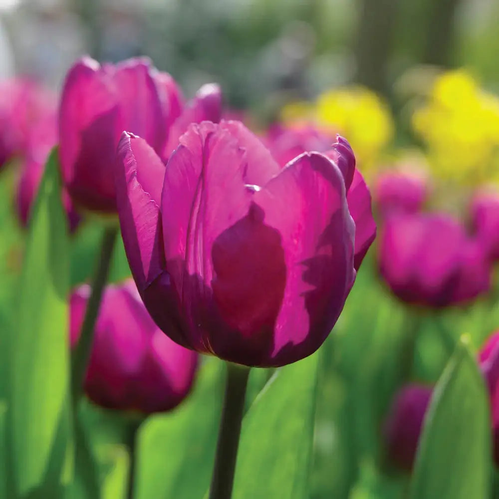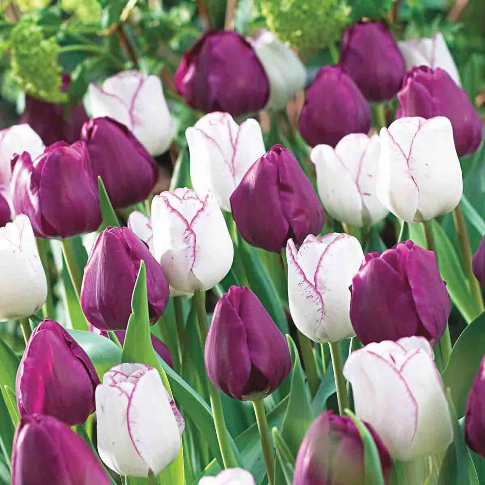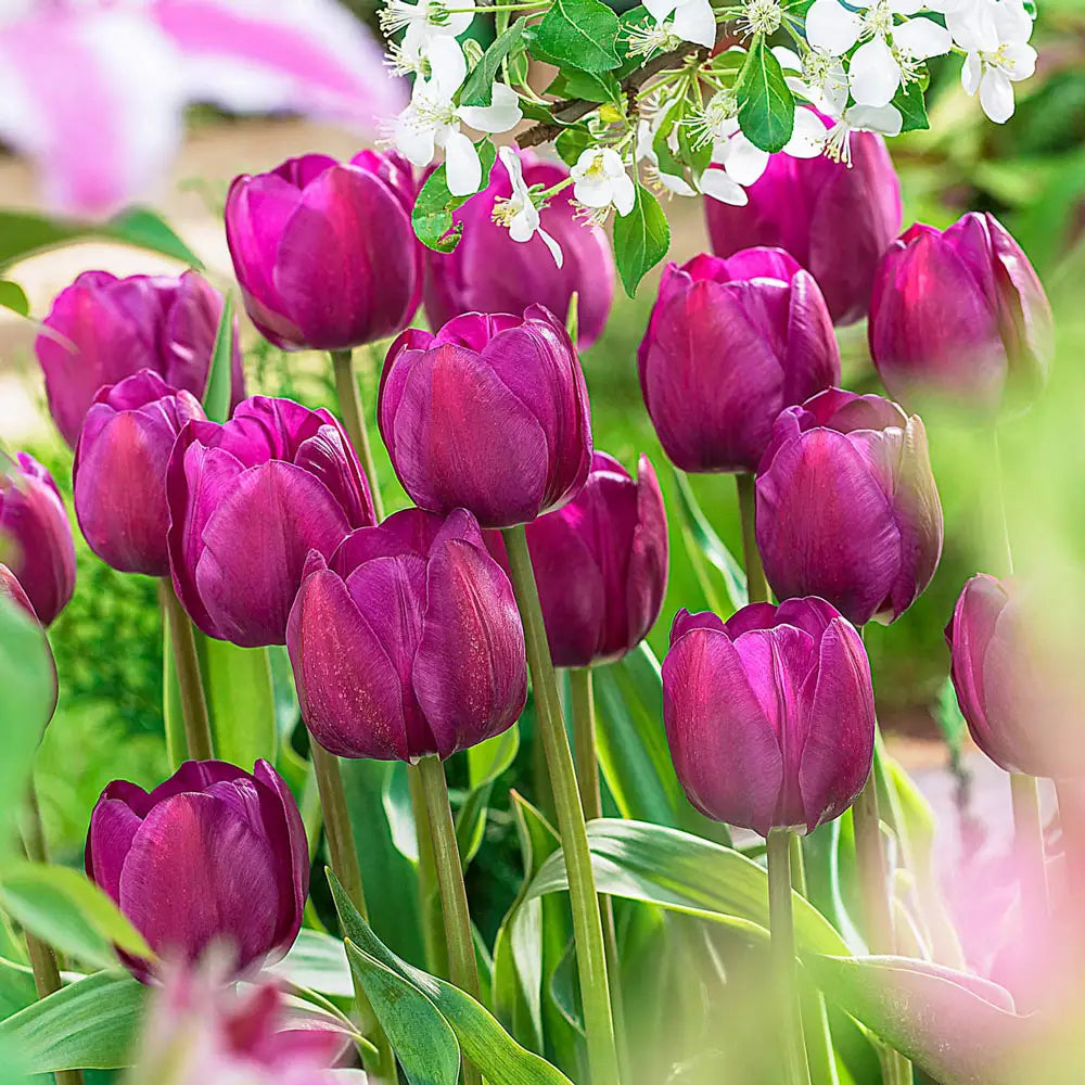Deep plum-purple flowers add plenty of drama to flower beds, borders, container plantings and cut-flower displays. Triumph tulips are the result of crossing the long-stemmed Darwin hybrid tulips with the short-stemmed early tulips. When planted outdoors, their flowering time is in between these two varieties, blooming late April through early May. With their strong stems, large flowers, and medium, 18" heights, triumph tulips are excellent as potted plants. Triumph Tulip Negrita is ideal for forcing for Valentine's Day or Easter. For best results, plant tulip bulbs in well-drained soil and in full sun to partial shade.