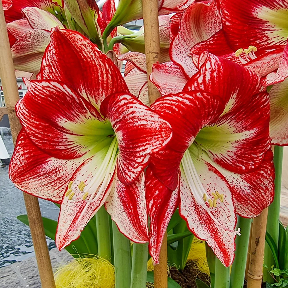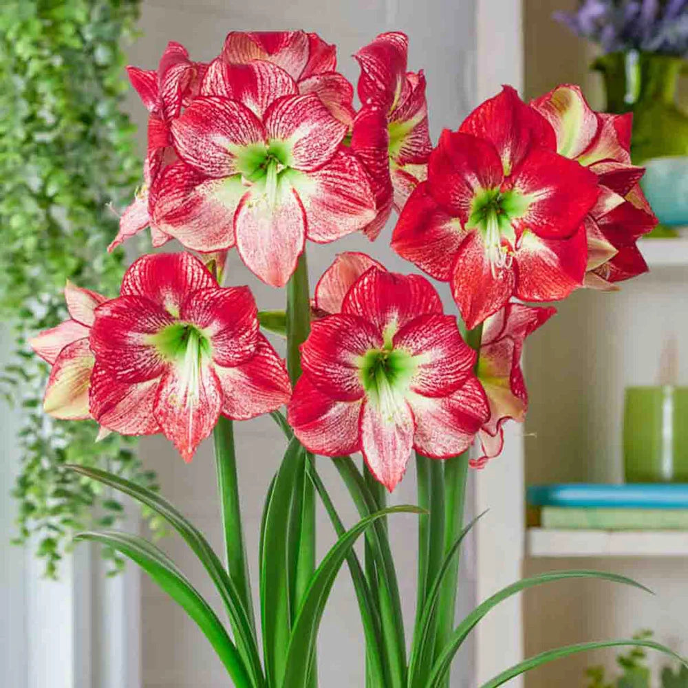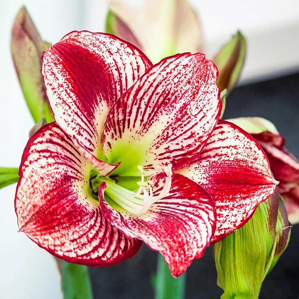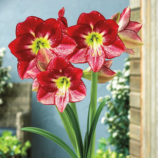 Amaryllis… just the name is exotic. Our new Flamenco Queen is a rare beauty that displays a lively coloration featuring bold red brush marks, fretting and edging—all highly desirable patterns in amaryllis. In fact, this variety was specially bred to provide indoor beauty and color through the dull days of winter. It bears its big, feathered and streaked blooms of snowy white and cherry red a mere 6-8 weeks after growth begins. Cool green centers add an extra pop of color. Like other amaryllis, this newcomer makes a fun and interesting addition to the home during the holidays, and it makes a great gift, too. Flamenco Queen is easy to grow and comes up fast.
