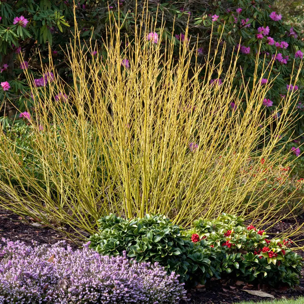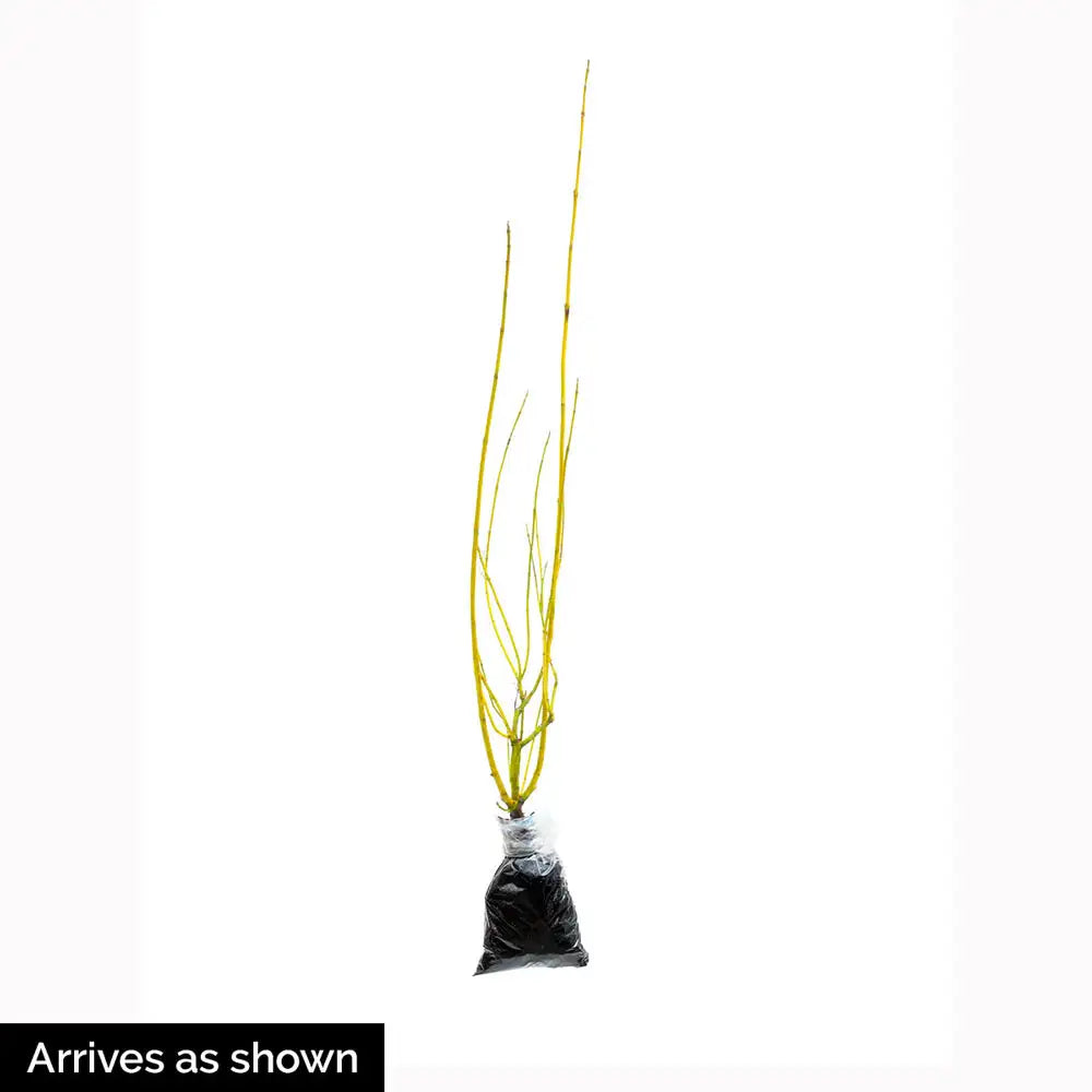 Budd's Yellow Twig Dogwood is a fast-growing shrub that adds year-round interest to gardens and landscapes. Planting this shrub as a flowering hedge along property boundaries and walkways is a great way to give landscapes a professional look. This multi-stemmed shrub grows 5-8 ft. tall and has a 4 ft. spread. In the spring, its yellow-white flowers open and attract butterflies. In the fall, its variegated green and yellow leaves deepen to an eye-catching red. In the winter, its bright yellow stems add color and interest to the landscape. Deer tend to pass it by. Yellow Twig Dogwood grows best in full sun to partial shade and prefers fertile, well-drained, neutral to acidic soil. The Yellow Twig Dogwood Hedge is ideal for landscapers wanting to create hedgerows.
