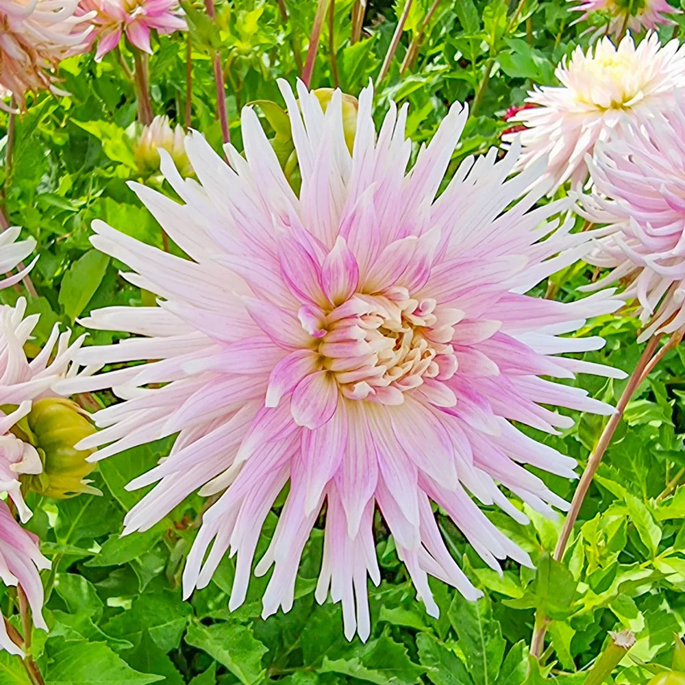 For an outdoor space with style and flair, a liberal planting of Kiev Cactus Dahlia is just the ticket! Vigorous plants boast prolific, long-lasting blooms that are fully double and grow to an impressive 6" across. The flowers emerge white blushed with soft pink, but transform to bluish-pink and purple over time. The lightly hued, spiked blooms look amazing against the plant's bushy, deep green foliage. Kiev is perfect in small groups to anchor a seasonal border or in a mixed presentation bed.