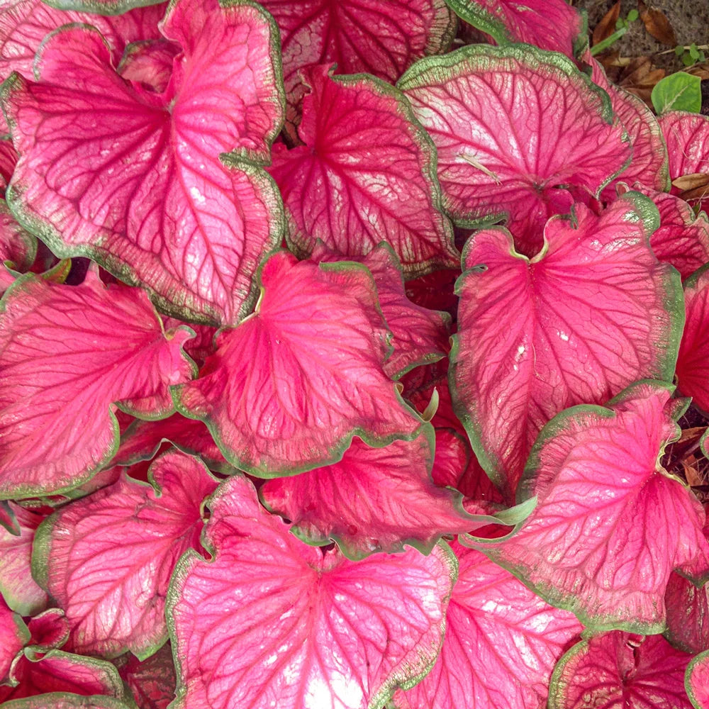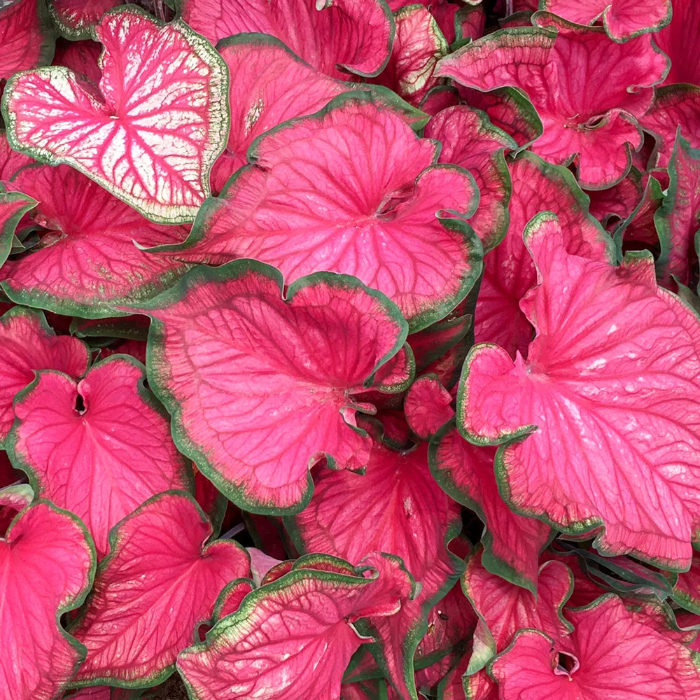 Sizzle Pink, the newest Caladium in our lineup, is sure to brighten shady spaces with its heart-shaped, vivid pink leaves that are wildly ruffled and feature a smattering of white and a bright green edge. Plus, the color changes, depending on where you plant it. In full sun, the foliage appears more red, while full shade creates a deep rose-pink hue. Ideal for mixed container plantings or as a shade garden staple. Mix with ferns or hostas for a more dynamic look.