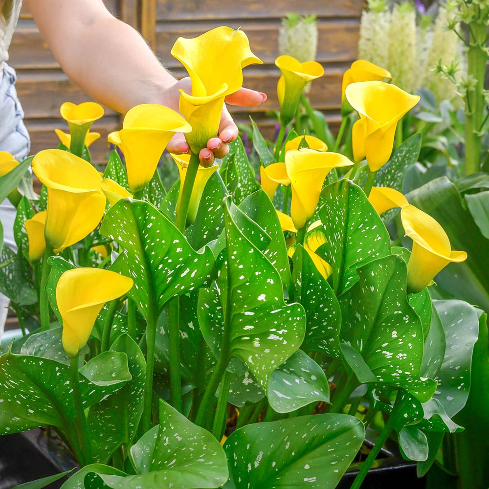 For a summer floral display that will have folks talking, we suggest a liberal planting of Gold Crown Calla Lily. This breathtaking calla features huge, golden yellow flowers that not only survive in hot, sunny locations, they thrive. The more sun they get, the better they bloom. The classic vase-shaped flowers are set amidst attractive, deep green, speckled foliage. The plants are compact at 18-24" tall, and make great additions to borders and patio pots. Good for cutting, too.