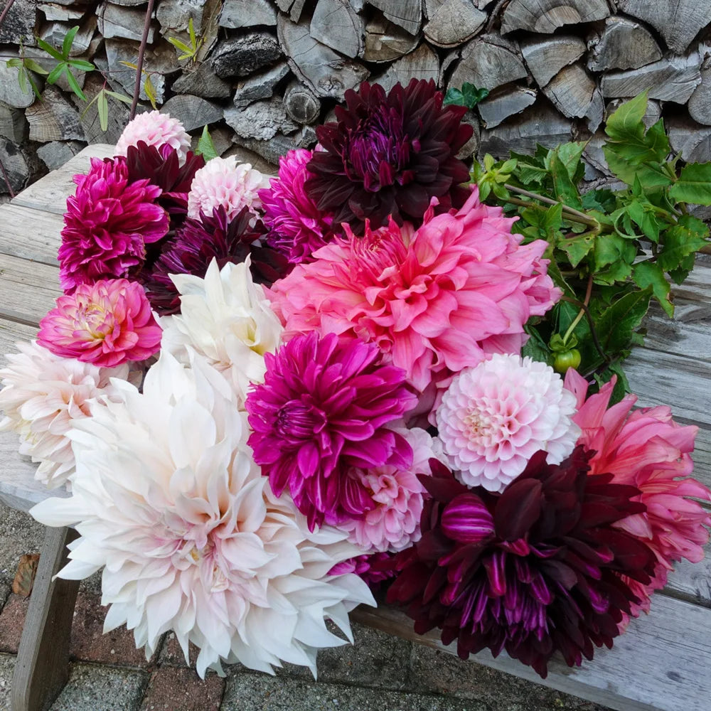 Treat your customers to a new dahlia mixture that's sure to become a favorite! Four unique varieties—Café au Lait, Otto's Thrill, Rip City and Stolze von Berlin—make up our newest blend, the Cherry Cordial Dahlia Mixture. All fully double, all medium to very large blooms, the flowers in this mix open in shades of pink, cream and deep maroon, creating a harmonious look in cut-flower bouquets, perennial borders or presentation beds. We love to see this long-blooming mix planted in generous groups for a lush display with tons of sweet color. Flowers appear in midsummer and continue until fall's first frost.