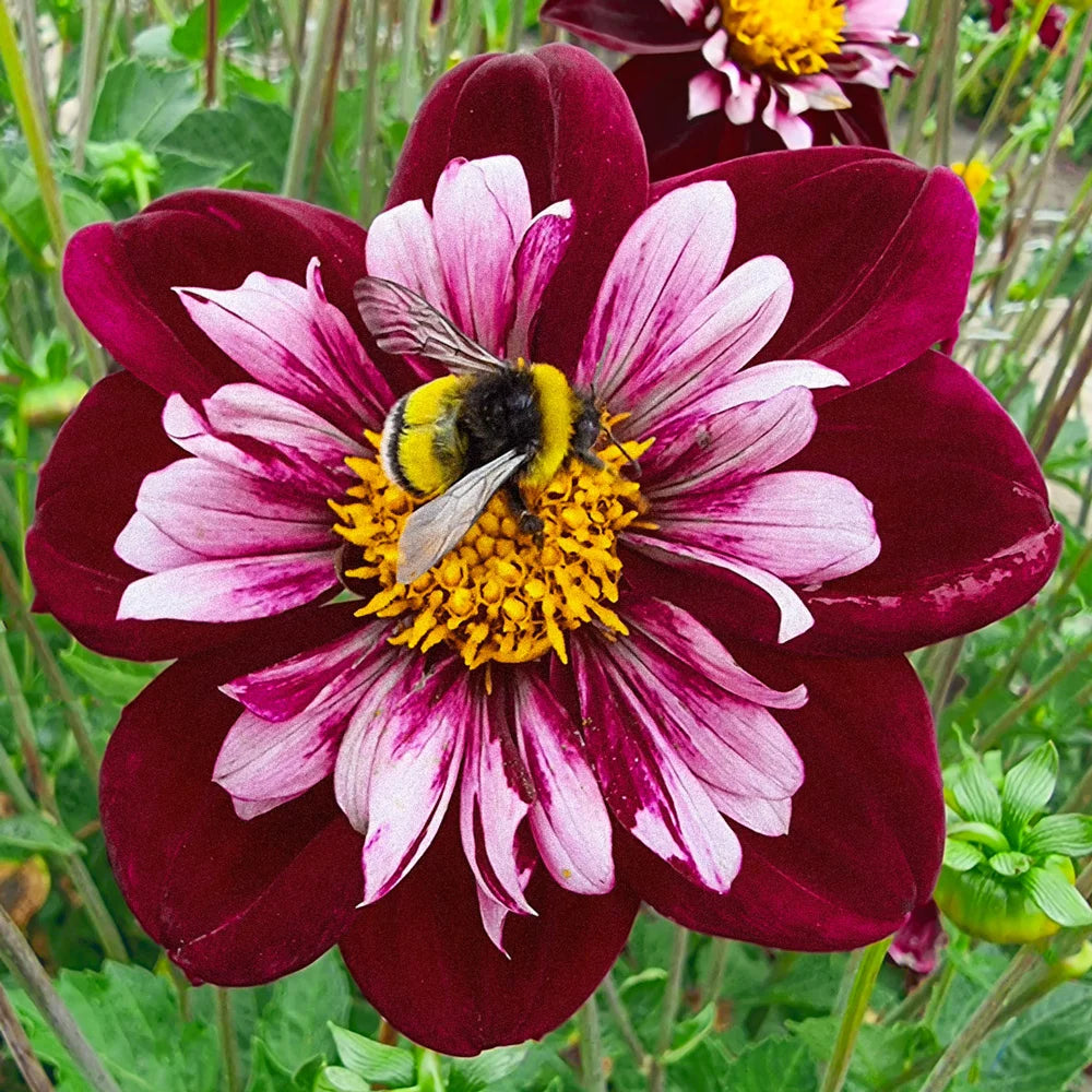 Bold, deep red petals encircle shorter inner petals tipped in white, while a fluffy yellow center attracts nearby bees, butterflies and hummingbirds to the area. Joyful Investment Dahlia is a visual standout in the garden, border or indoor arrangement. The contrasting colors of the petals and the warm-hued heart produce maximum impact, especially when planted in groups. An extended bloom period ensures plenty of flowers for everyone to enjoy.