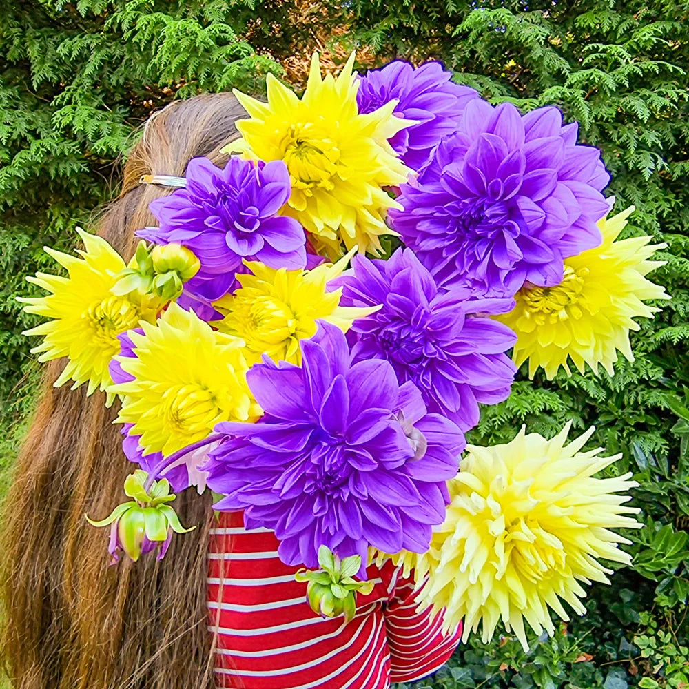 Prepare to be amazed at the gorgeous colors and fantastic flower forms these dahlias maintain over an extended period of bloom. Our new duo of dahlias features semi-cactus 'Gelber Vulcan' in a bright shade of sunshine yellow, and 'Lilac Time', a decorative double variety of vibrant lilac-purple. The two together create a vivid, complementary display in midsummer borders, cutting gardens, and more! Certain to become a favorite of homeowners and landscapers alike.