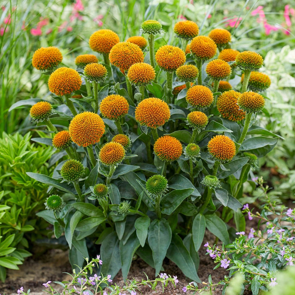 Get ready for something completely different. Drumstick Yellow offers a unique twist on traditional coneflowers with its petal-less flower form. Bushy plants produce multiple stems that are topped with large, orange-yellow cones that stay attractive over a long period. The bright color, paired with the singular look, makes this a standout choice for cut-flower arrangements and border plantings. Pollinators love it, too! Size: #1 Root.