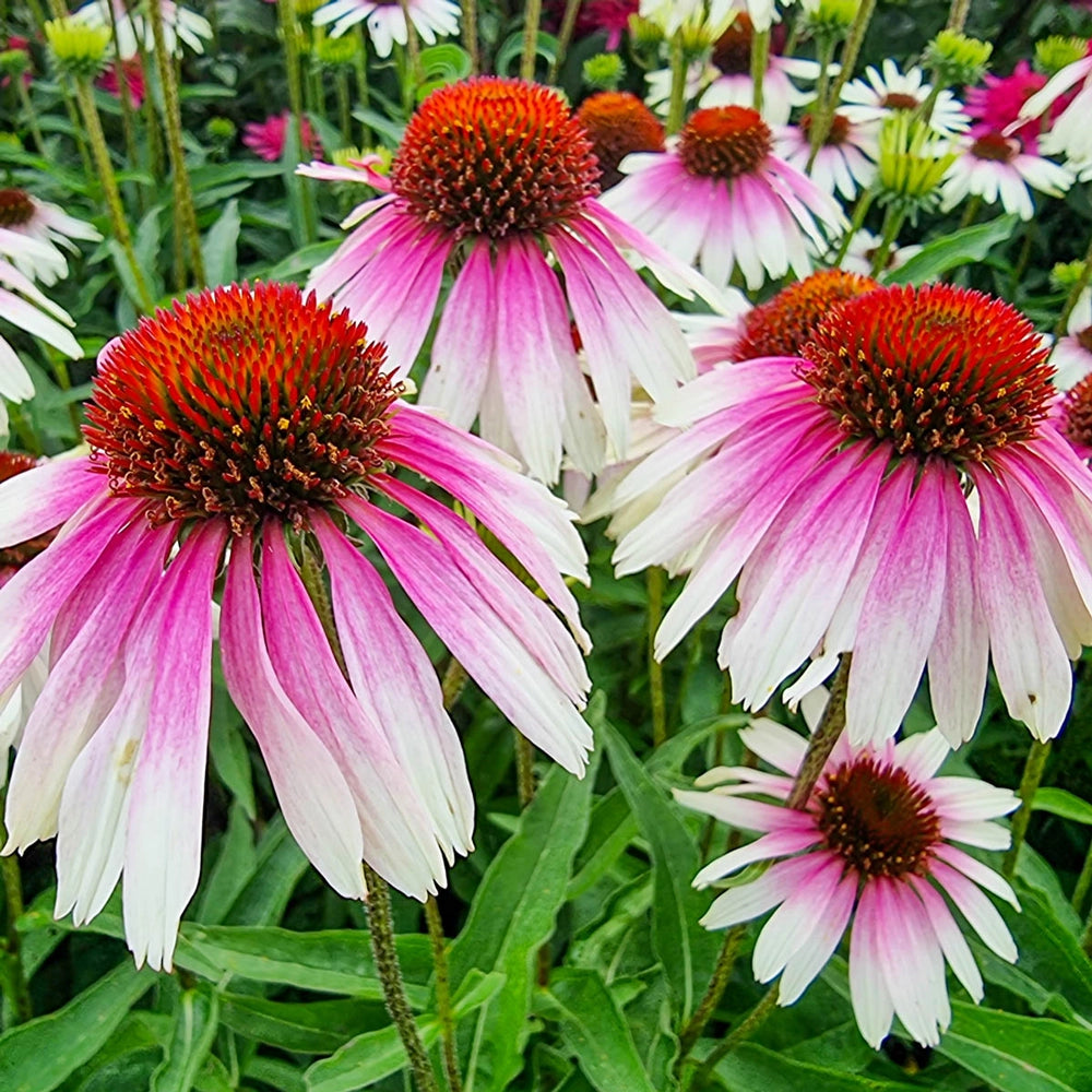 Distinctively lovely and a breeze to grow, Sombrero White-Purple stuns with daisylike blooms dotted with prominent cone centers and single, white petals flushed with purple. A true pollinator magnet, this versatile variety is a standout addition to sunny borders, cutting gardens and more. Rabbit and deer resistant, the drought-tolerant 20-22" tall plants are well branched and produce plenty of blooms over a long period. Plant in full sun.