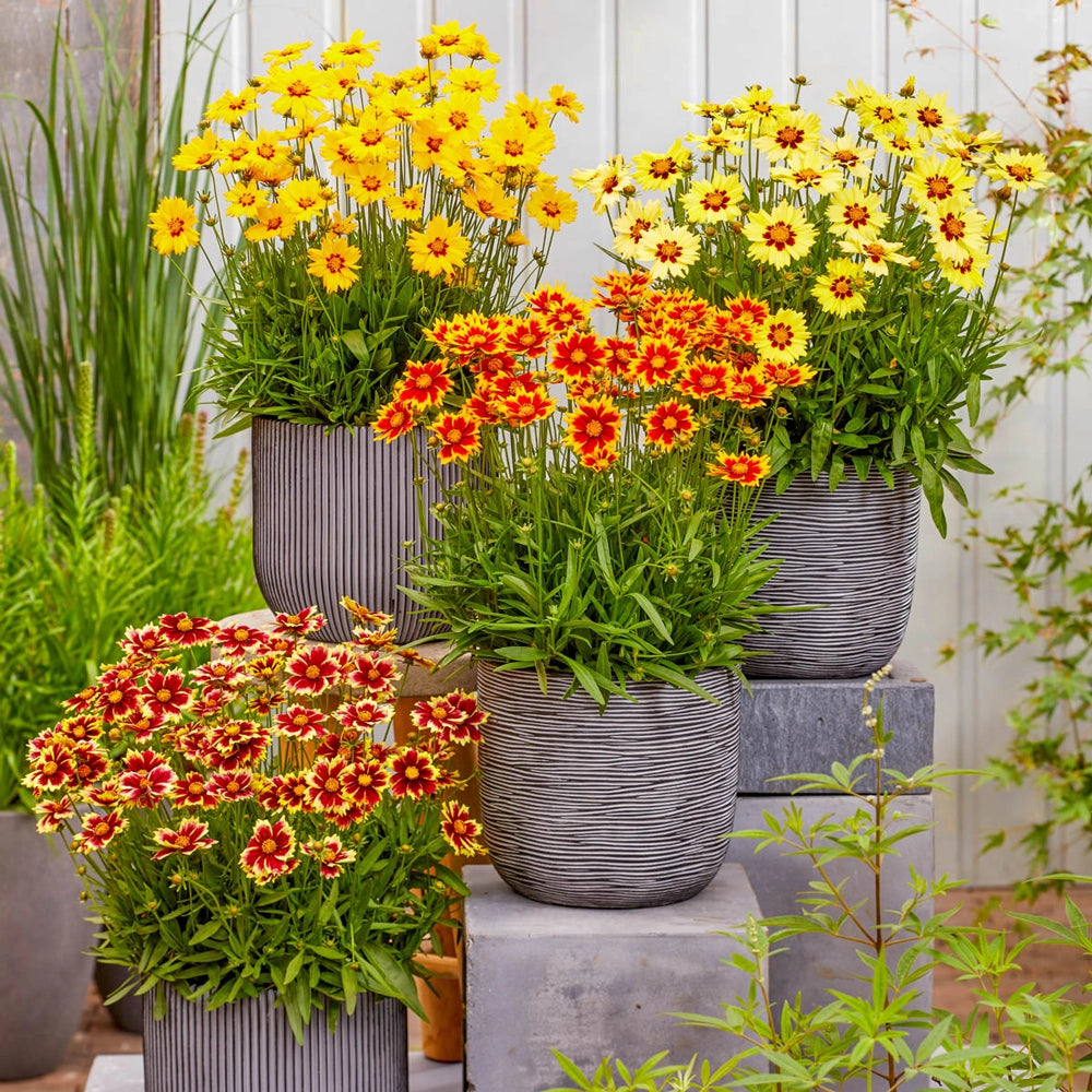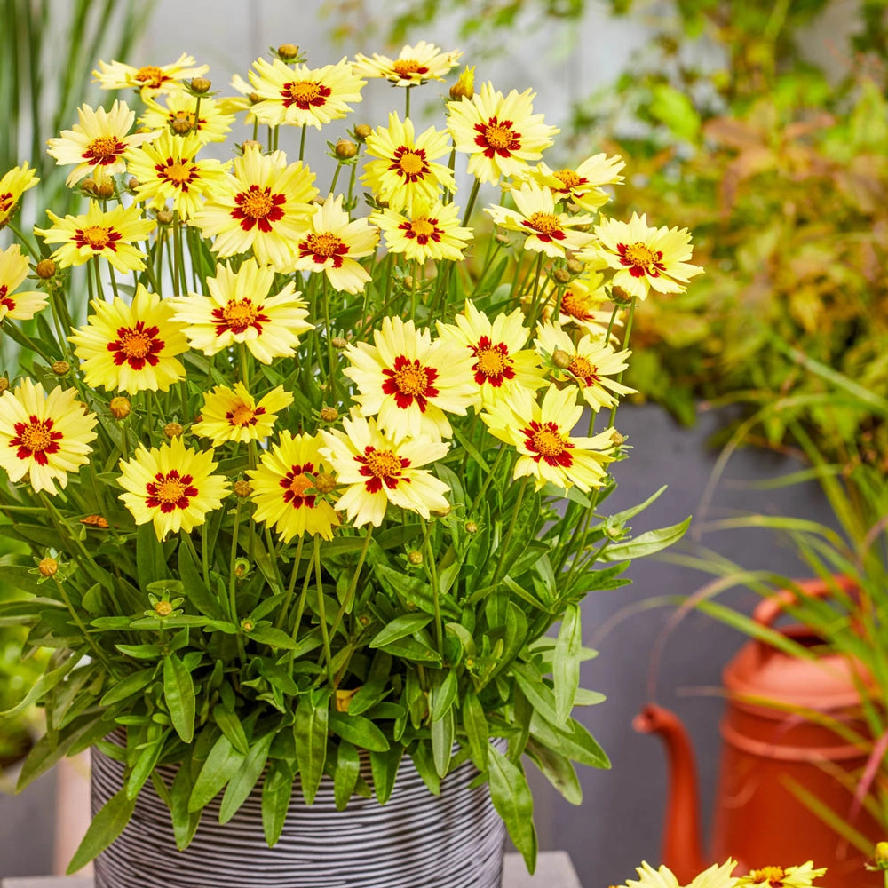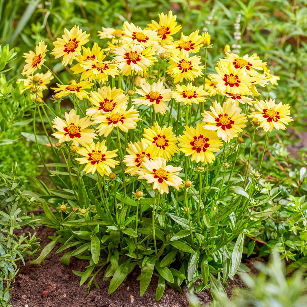 Beautiful but tough, Solar Moon Coreopsis bears all the best of both qualities. Single, daisylike blooms soft yellow are dotted with deep red hearts and cover tidy, 20" mounds of foliage from June to October. The flowers are highly attractive to passing pollinators and butterflies, which stop by frequently to add a touch of charm to borders and beds. Fabulous in arrangements, whether used fresh or dried. The plants are highly resistant to disease, and exhibit excellent tolerance to heat, drought and humidity. An all-around winner in the garden or landscape. Solar Moon perennializes well, surviving the cold days of winter like a champ. PP35140