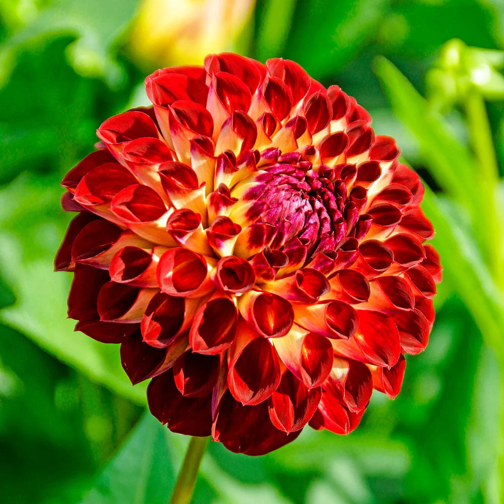 Very floriferous, two-tone variety produces showy, 4" ball-shaped flowers with brick-red petals and creamy yellow reverse. Creates warm, cheerful effect in the garden. Also ideal for cut flowers.