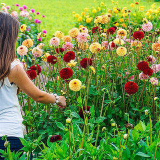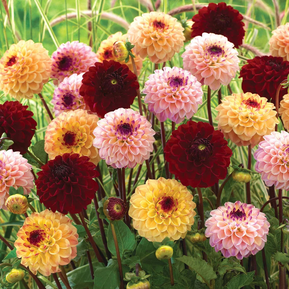 Charmingly small, ball-shaped pompon flowers in a mixture of colors. We hand selected a mix of Red Jill, Wine-Eyed Jill and Yellow Jill varieties for a prismatic display in the summer to fall landscape. 2-3" blooms. Ideal as cut flowers.