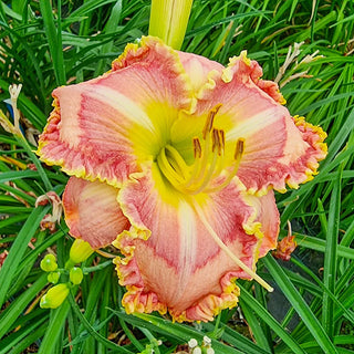 We love this new daylily, and we know you will, too! Princess Tutu is a highly productive rebloomer that bears over 300 blooms after just three years. Large, 6" bright pink flowers boast a darker pink eye and heavily ruffled edges in two-tone pink and gold. Makes a fantastic border or walkway planting, where the blooms may be closely admired by passersby. Perfect for butterfly gardens and feature beds, too. An early-season bloomer, it reblooms in late summer to early fall. Semi-evergreen foliage.