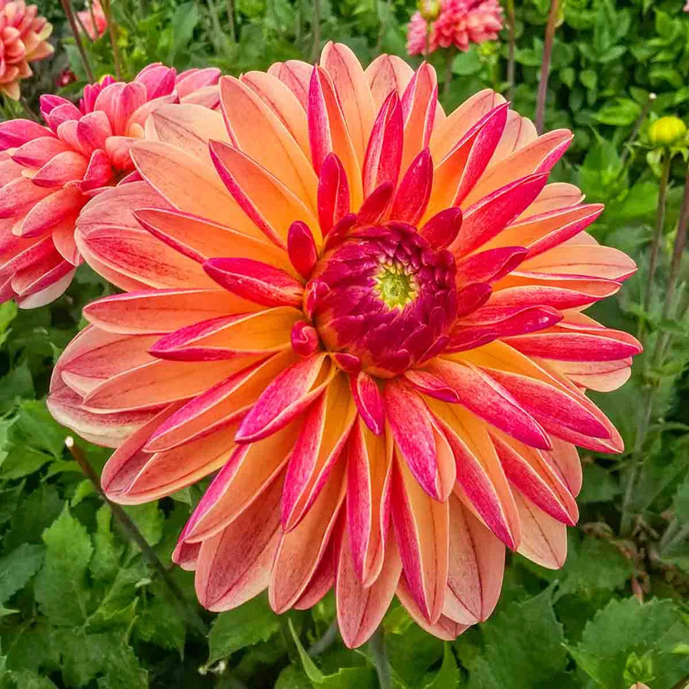 A striking dahlia with an even more dazzling coloration, Madame Antoinette is the ideal choice for creating a head-turning garden display. Fully double, 4-5" blooms showcase coral-peach blooms with deep magenta centers. The unique cupped shape of the petals effectively displays the vivid fuchsia-pink undersides, giving the blooms a breathtaking bicolor effect. The showy flowers cover a carefree, 36" tall plant from summer to frost. Great for cutting!