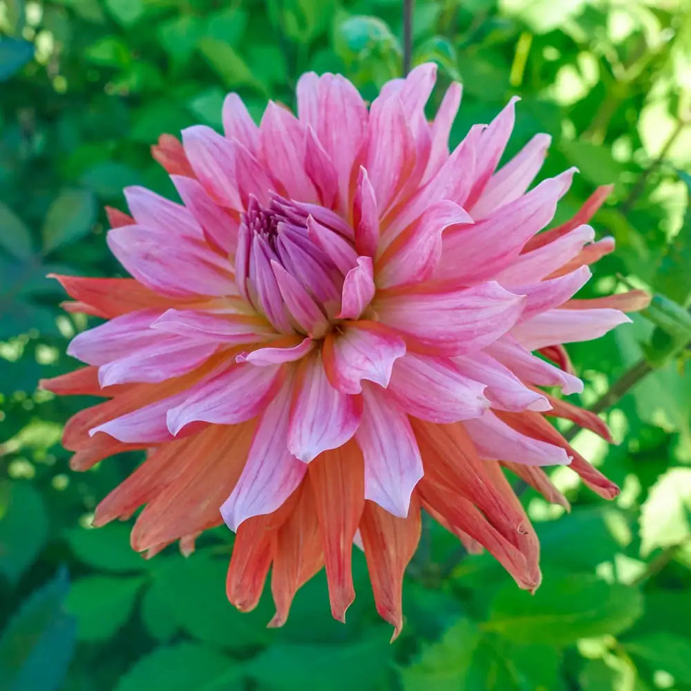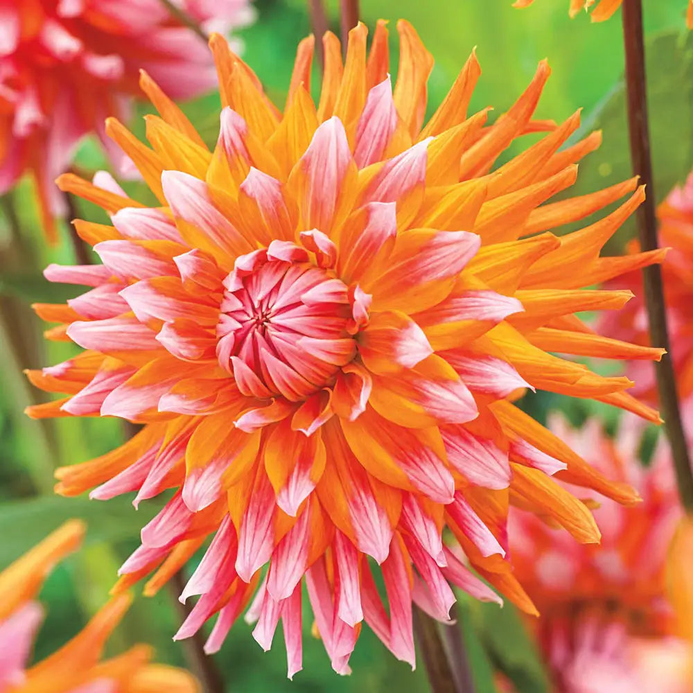 Introducing a new decorative dahlia with a nearly indescribable color and an iridescent quality that can't be missed! Orange Turmoil steals any garden scene with full, lush blooms in an array of hot hues. The orange dahlias are highlighted by shimmering shades of white, pink, apricot and red, giving a luminescence not often seen in dahlias. Planted in groupings, the effect is quite enchanting. The long-lasting blooms are ideal for cutting gardens, borders and presentation beds near an entrance or walkway.
