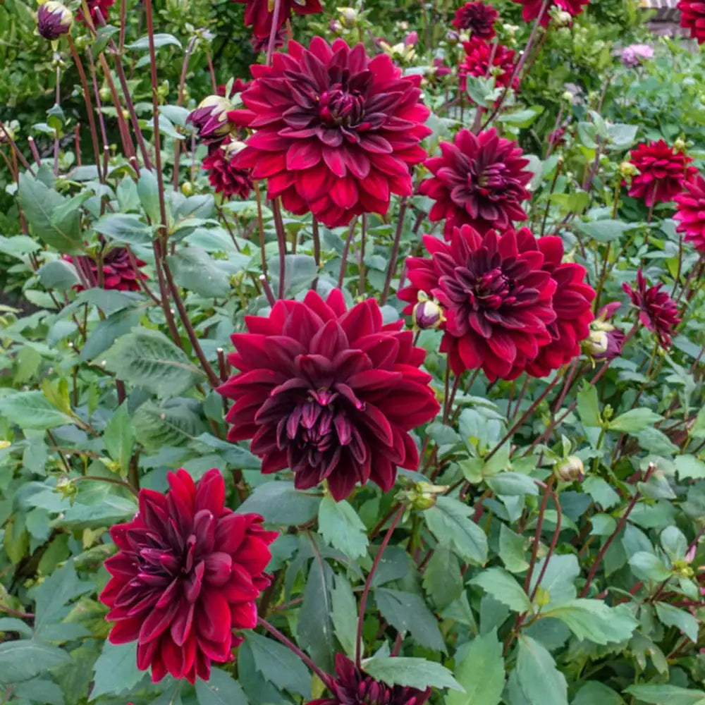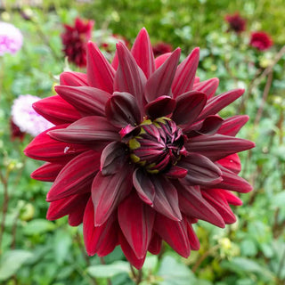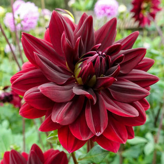 'Eye-catching' doesn't even begin to describe this new Dahlia. Sam Hopkins is a true showstopper in the landscape, bearing rich, deep red blooms with a velvety sheen over a long period. Not only that, but each striking bloom features a blackish-red center that gives it a decidedly two-toned effect. Plant in groups in full-sun areas to show off the 5" fully double flowers to best advantage. Pairs beautifully with lighter-hued blooms. Great for borders or entryway feature beds. Makes an exquisite cut flower, too.