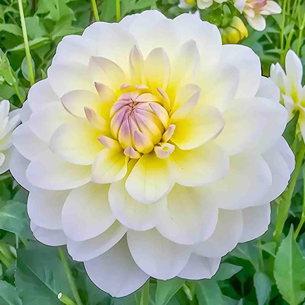A staff favorite from our test gardens, Sandia Serenity charms in a perfect 5" flower form and creamy white petals tipped in a lavender blush, and showing soft yellow at the centers. The overall effect is quite dreamy, and from a distance, the blooms appear white with pale lavender. Only a closer look reveals the pale yellow interiors. Robust, 48" tall plants are fast growing, highly productive and make a nice appearance in the landscape with rich green foliage and a plethora of fully double blooms from midsummer to frost. Gardeners can enjoy Sandia Serenity indoors as a stellar cut arrangement, or outdoors in a back border or large container.