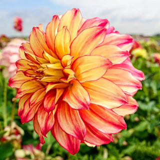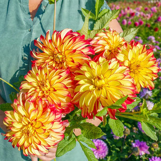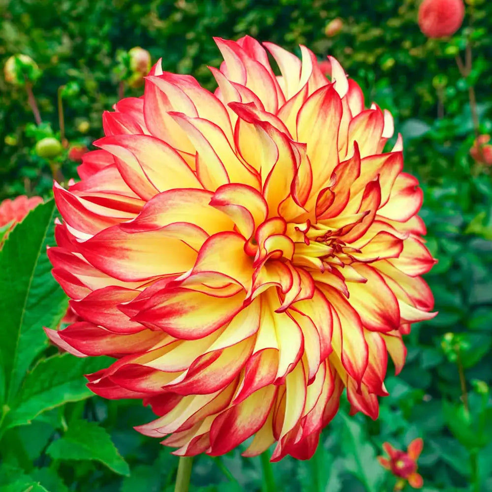 Add impact and rich color to the landscape with the massive blooms of Lady Darlene. Showy yellow petals with red midribs and tips give it a flame like appearance. These stunning flowers grow  9" in diameter and prove to be a spectacular show in sunny borders and vases. Blooms all summer long through October. Remove spent flower heads to encourage more blooms and maintain a neat appearance. Easy to grow, but not hardy, take care to lift tubers in zones 3-7 in the fall and store in a dry, frost-free location. Deer tend to avoid.