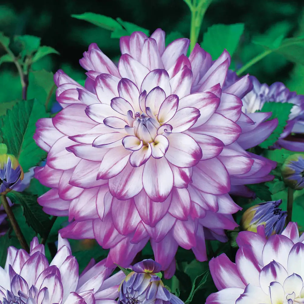 This mysterious dahlia magically changes colors from light purple to white within a single season. Who Dun It arrives on the scene as a 6" fully double bloom in a luxuriant shade of lilac, but quickly transforms to mauve, then lavender-blue, while white petals take over in the final days. Sturdy, vigorous plant produces dozens of large blooms during the long growing season. Makes a great cut flower, as well as a fine decorative statement in borders and mixed beds.