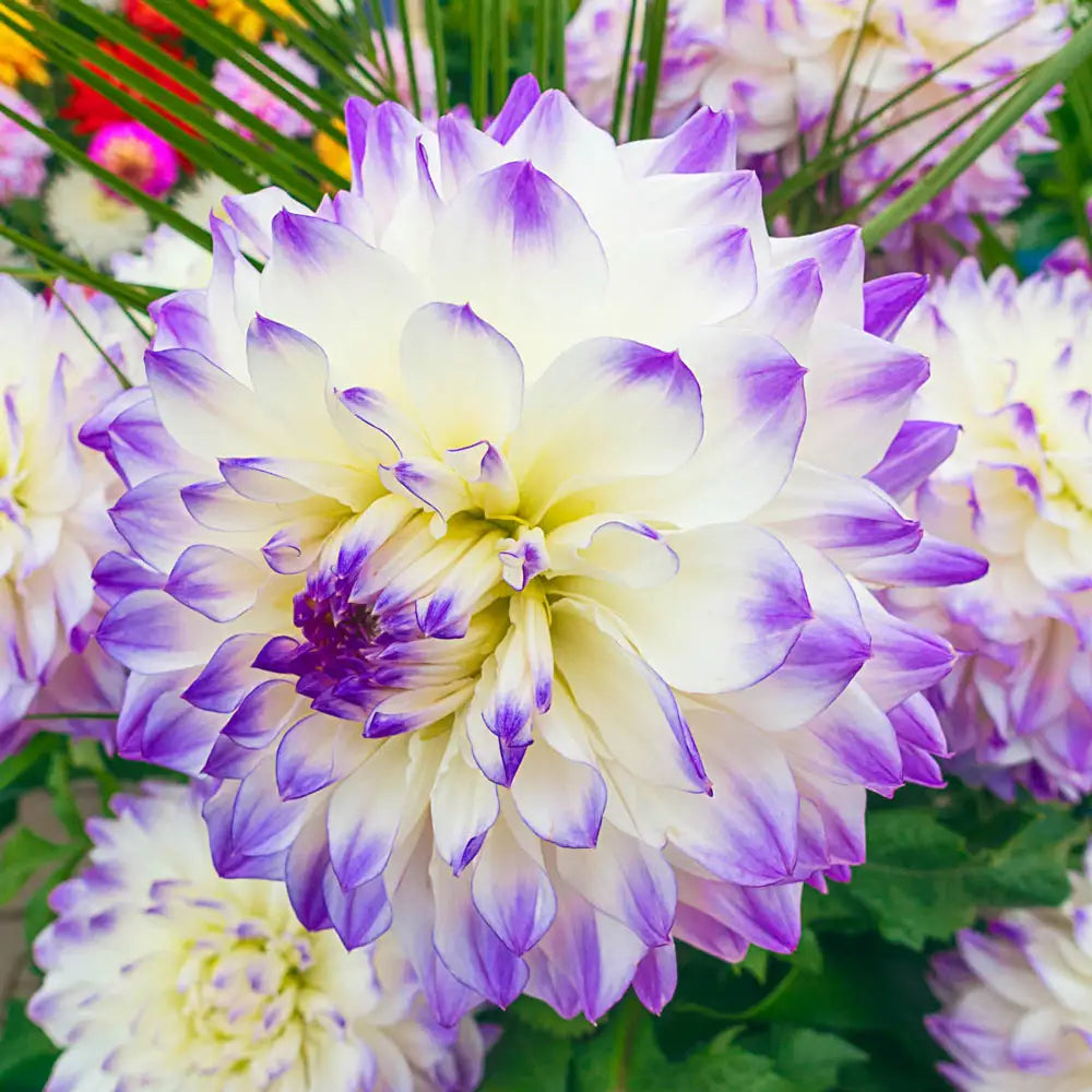 For midsummer landscapes that stun with huge, striking blooms in an elegant, soft color until the first frosts of fall, look no further than this chic new offering. Hapet Blue Eyes is a Dinnerplate Dahlia with a decorative flair. Very large, 8" fully double, white flowers are gently accented with lilac at the tip of each petal. This is a sturdy cultivar that boasts strong, straight, 40" stems perfect for cut-flower arrangements with size and substance. We like to see them in groups along a sunny back border or as an anchor plant in a mixed bed. For best results, plant in full sun and remove spent flowers for a neat appearance. Lift in fall in zones 3-8.