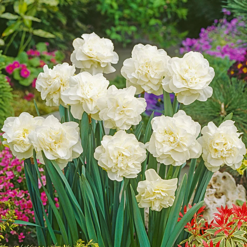 What's not to love about this unique color-changing daff? Obdam is a fragrant, double variety that features a delicate white perianth and petaloids that encircle a yellow corona that ages to white. You may see a touch of green in the outer whorl of the blooms, which only adds to Obdam's charm. Enjoy a bevy of blooms from April to May, perfect for waking up springtime borders and cutting beds. Best planted in small groups.