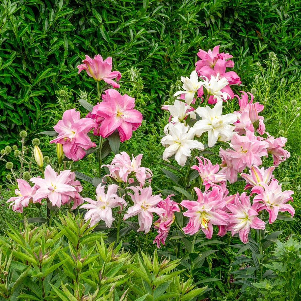 Introducing a mix of double Oriental lilies that is sure to put a smile on any gardener's face. Our Double Oriental Lily Lotus Mix features both pink blooms and white with streaks of soft and deep pink. The 6" double flowers are tantalizingly fragrant and so fluffy and full. Plus, they are pollen-free, so they are excellent for cutting to enjoy indoors in arrangements and bouquets. Gardeners often remark on how these luxurious double lilies fill out their borders and feature beds with color, form and texture. For best results, we suggest planting in full to part sun in well-drained soil, though they will tolerate some heavier soils