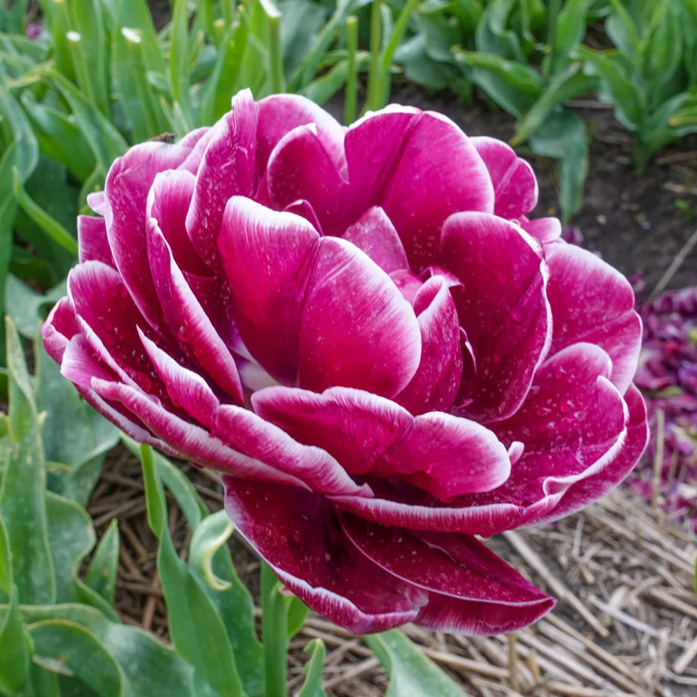 Late-spring borders sizzle with color thanks to this double tulip. Full, fluffy blooms in a sweet blend of purple and raspberry red are edged in a soft silvery white, giving a glistening effect in the sunlight. The flowers are large at 5" wide, and make fabulously lush cut-flower bouquets. Plant in seasonal mixed beds or borders. Dream Touch pairs nicely with lighter-hued late tulips or peonies.