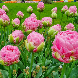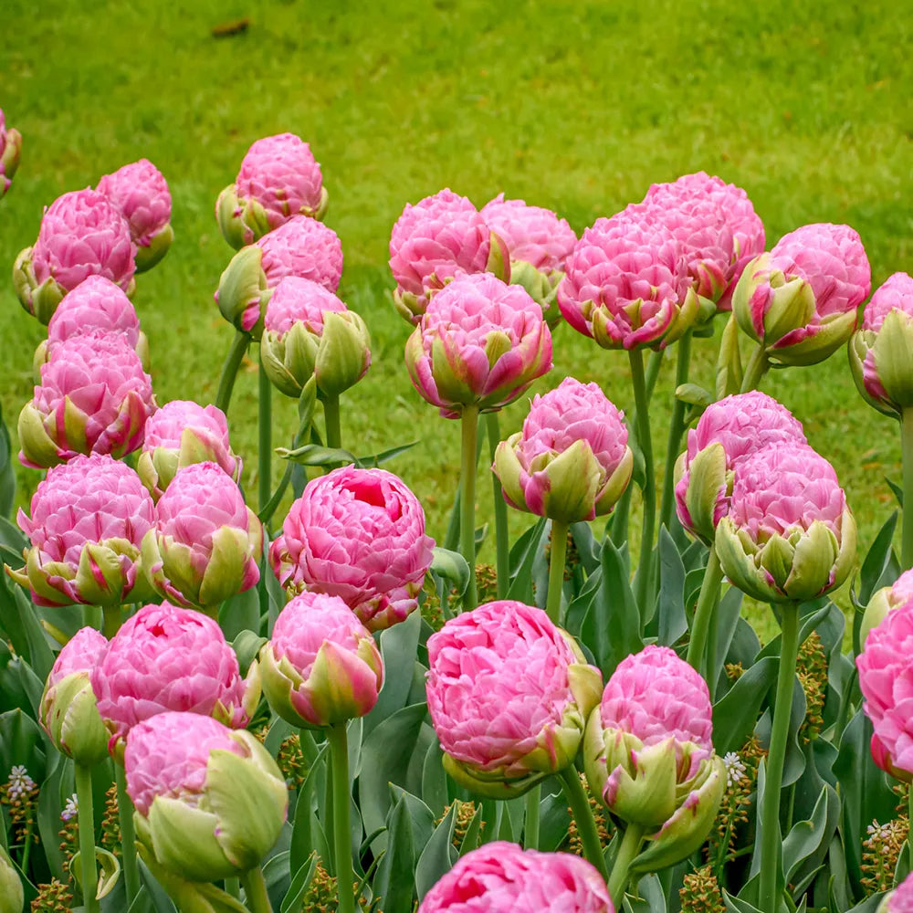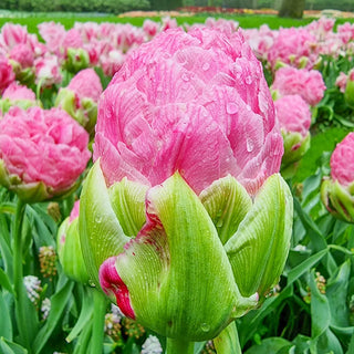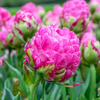 A completely new and unique flower form sets this tulip apart from its peers. Strawberry Cream’s unusual tower shape is made up of double layers of fluffy, magenta petals that open fully to reveal exceptionally large, 6" peony-like flowers. Makes a breathtaking display in the bed or border. Occasionally, multiple tulips will emerge from a single stem, creating an even more striking scene. An outstanding choice for cut-flower arrangements.