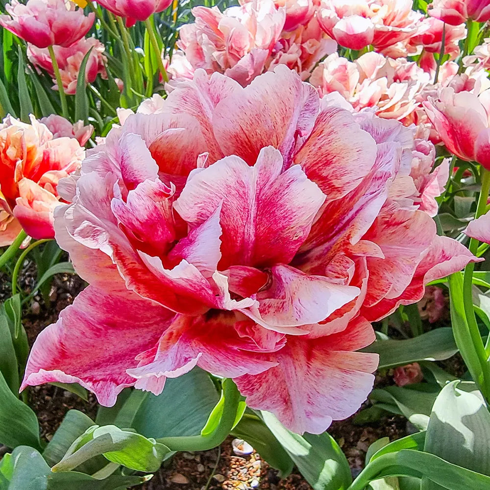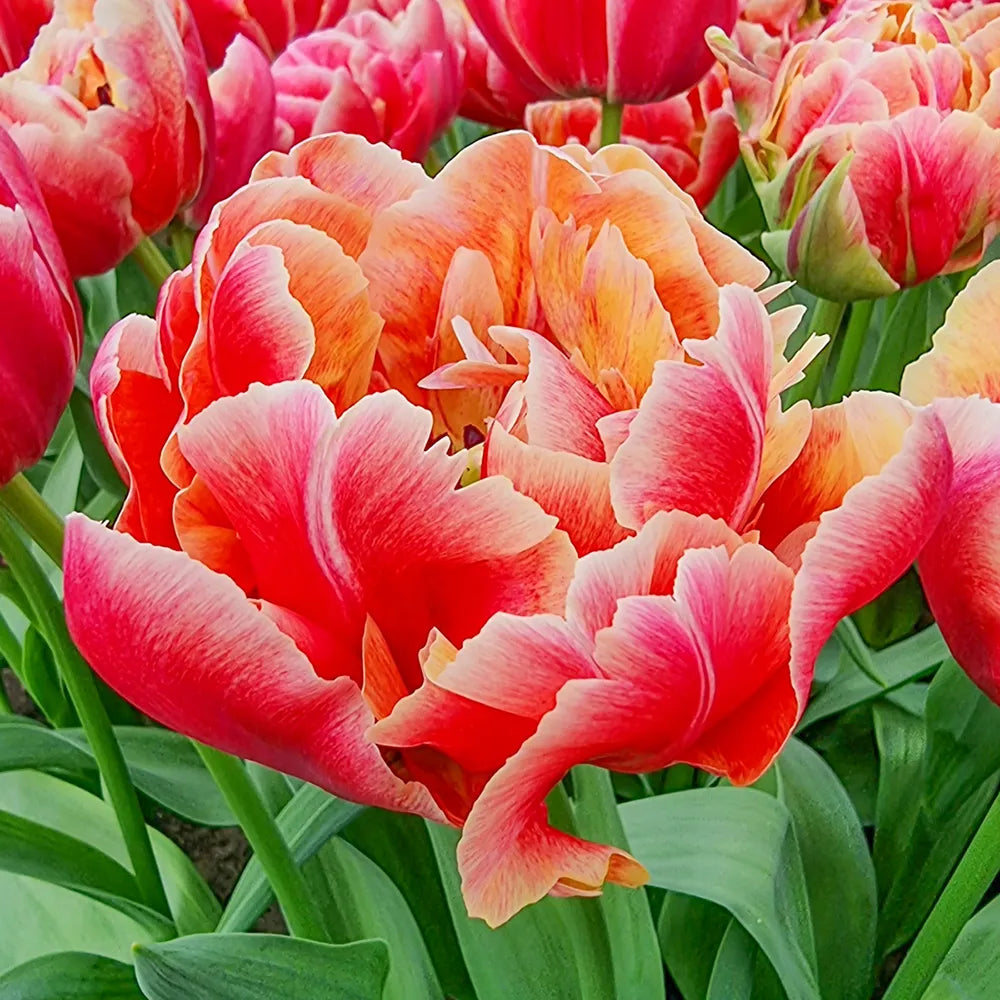 Delicate shades of peach, pink and champagne wash over the velvety petals of this highly sought-after peony-like tulip. Verona Sunrise showcases its superb coloration on large 4" fully double flowers, giving an elegant look to a truly robust and sturdy tulip. Strong stems easily hold the big blooms aloft, no matter the weather forecast. Wind and rain are no match for Verona Sunrise. Planted in groups along sunny borders or in mixed beds, it creates a luxuriant display second to none. An exemplary cut flower, too.