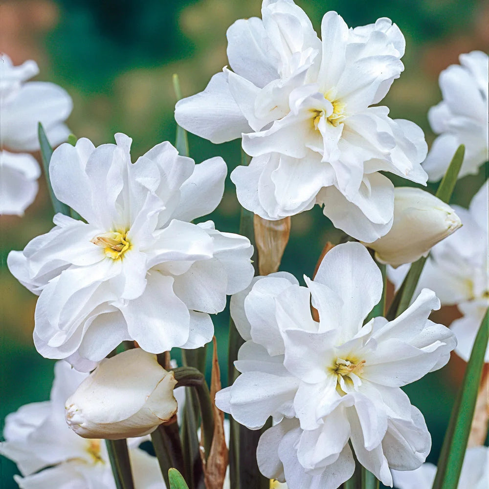 These dazzling doubles will catch any gardener's attention! Double Pheasant Eye Daffodil has double flowers in pure white. Very fragrant! With their 12-14" stems, these daffodils are great to grow in containers and make good cut flowers. Deer tend to avoid.