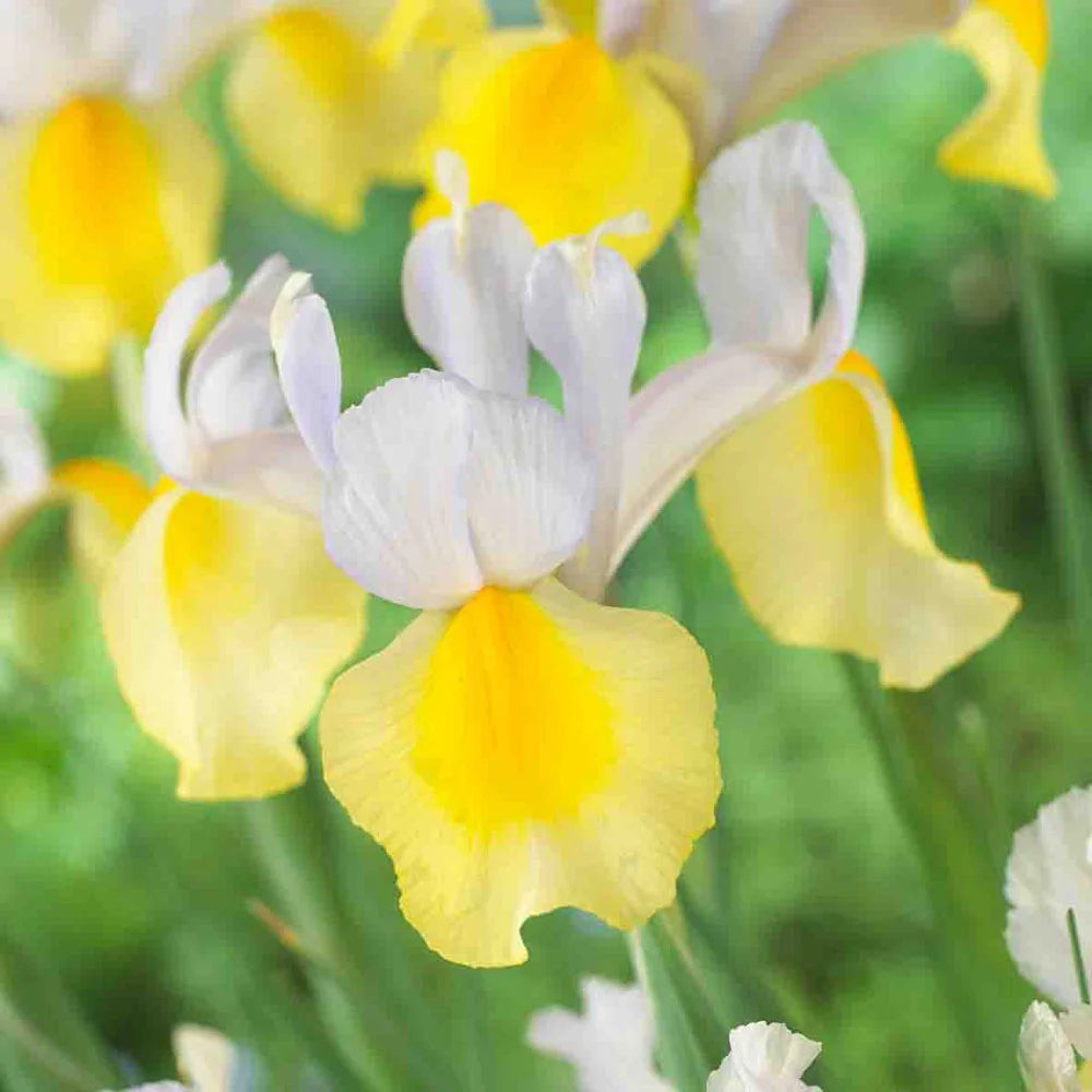Presenting a vigorous Dutch iris that shows its colors proudly. Elegantly formed blooms feature bright white standards atop glowing gold and lemon-yellow falls accented with deep mustard blotches. Placed in a sunny spot with well-drained soil, Montecito flourishes. Provides a beacon for nearby butterflies and pollinators, who will visit frequently during the growing season. A nice addition to cutting beds and mixed borders. Bulbs can be left in the ground year round.