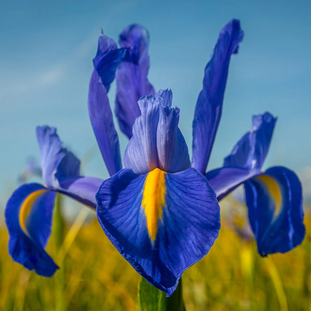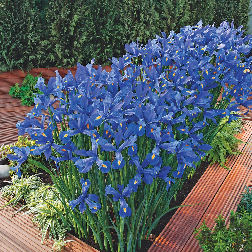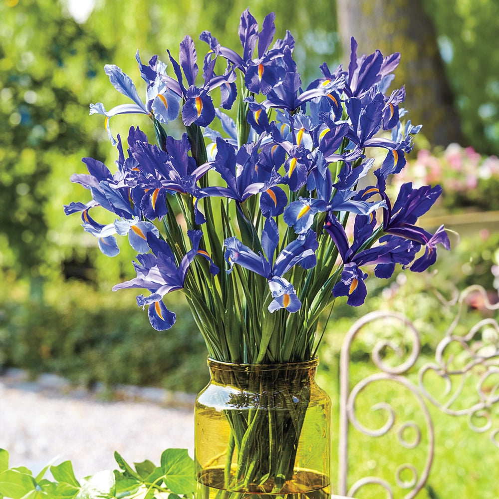 Our best blue Dutch iris! For the most impressive seasonal displays imaginable, we suggest a liberal planting of Sapphire Beauty. This newcomer to our already stellar Dutch Iris lineup bears rich blue flowers accented in soft blue and prominently feature a pop of bright yellow on each perfectly formed petal. Florists and gardeners alike adore Sapphire Beauty for its amazing shape and bold colors, but also because of its robust growing habit and highly versatile nature. Plant bulbs in full sun to partly shaded borders, mixed cutting gardens or seasonal landscape features. The 20-24" tall blooms make a lovely presentation wherever they are planted. Bulb size: 8+ cm.