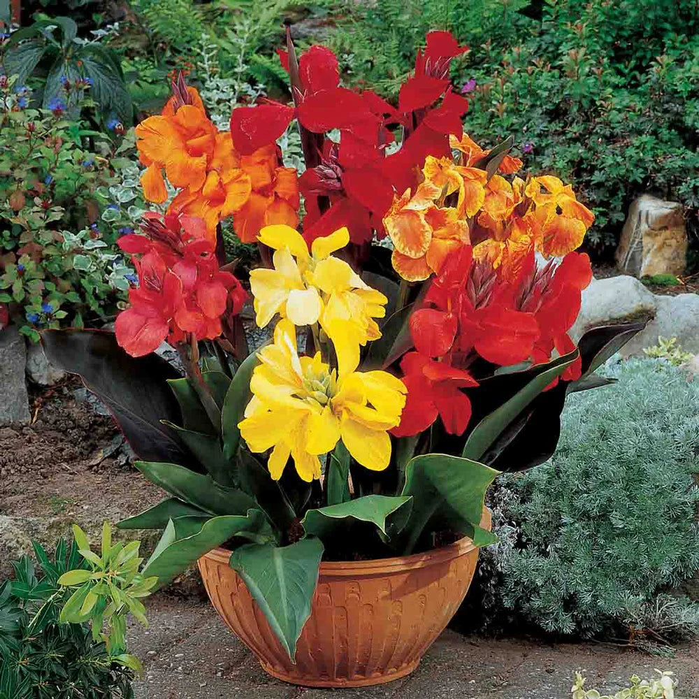 Bring bold and warm colors to beds and borders with Dwarf Cannas Mixed. This random mix of colors may include yellow, orange or red-hued flowers. Growing only 2-3' tall, these Mixed Dwarf Cannas are also ideal as potted plants for use on sunny patios, terraces or at entrances. Their showy flowers will delight from midsummer to the first fall frost. Green, tropical-looking foliage provides a spectacular backdrop to the flowers. You can start dwarf cannas indoors in February or later for gorgeous summer blooms. Move them outside after spring frost.