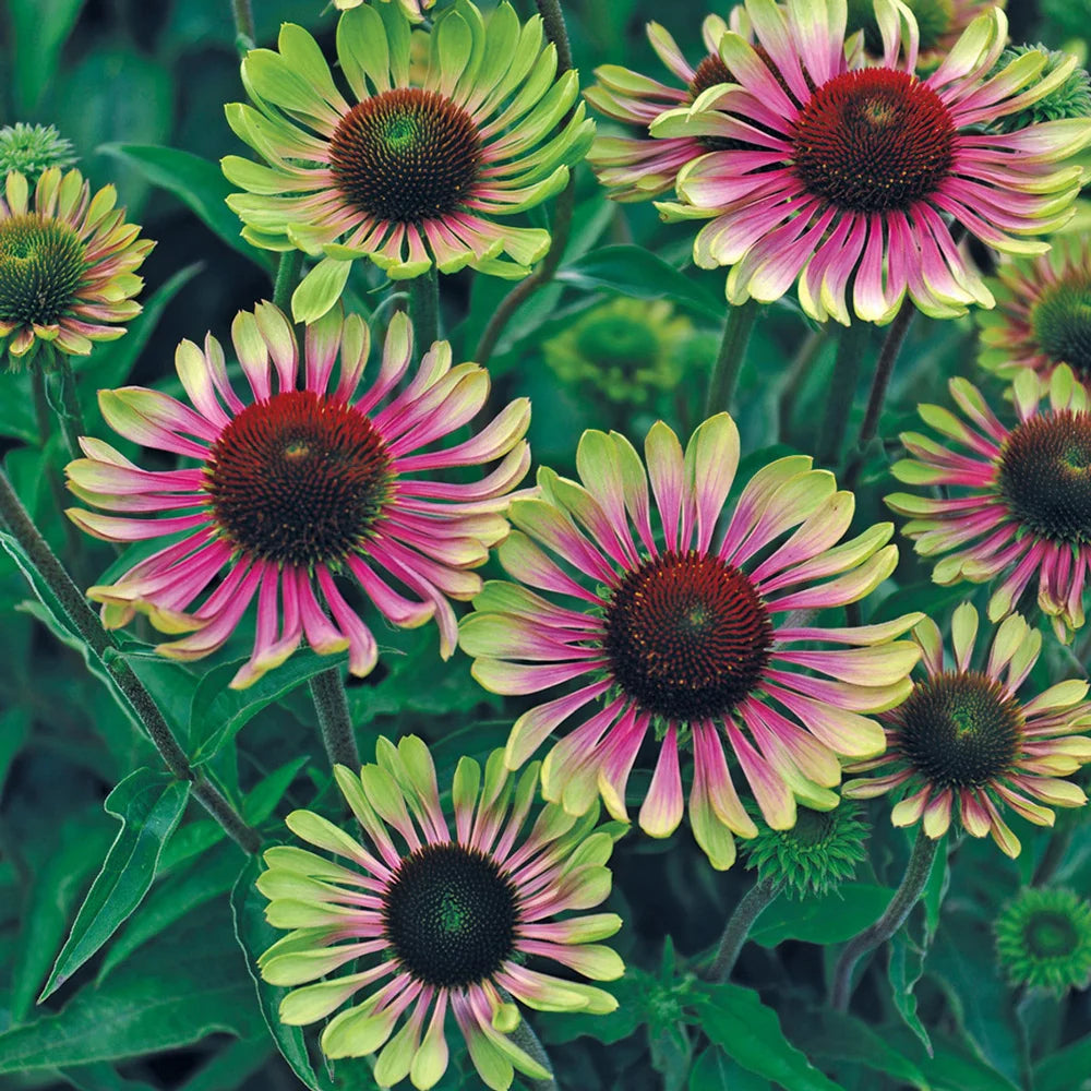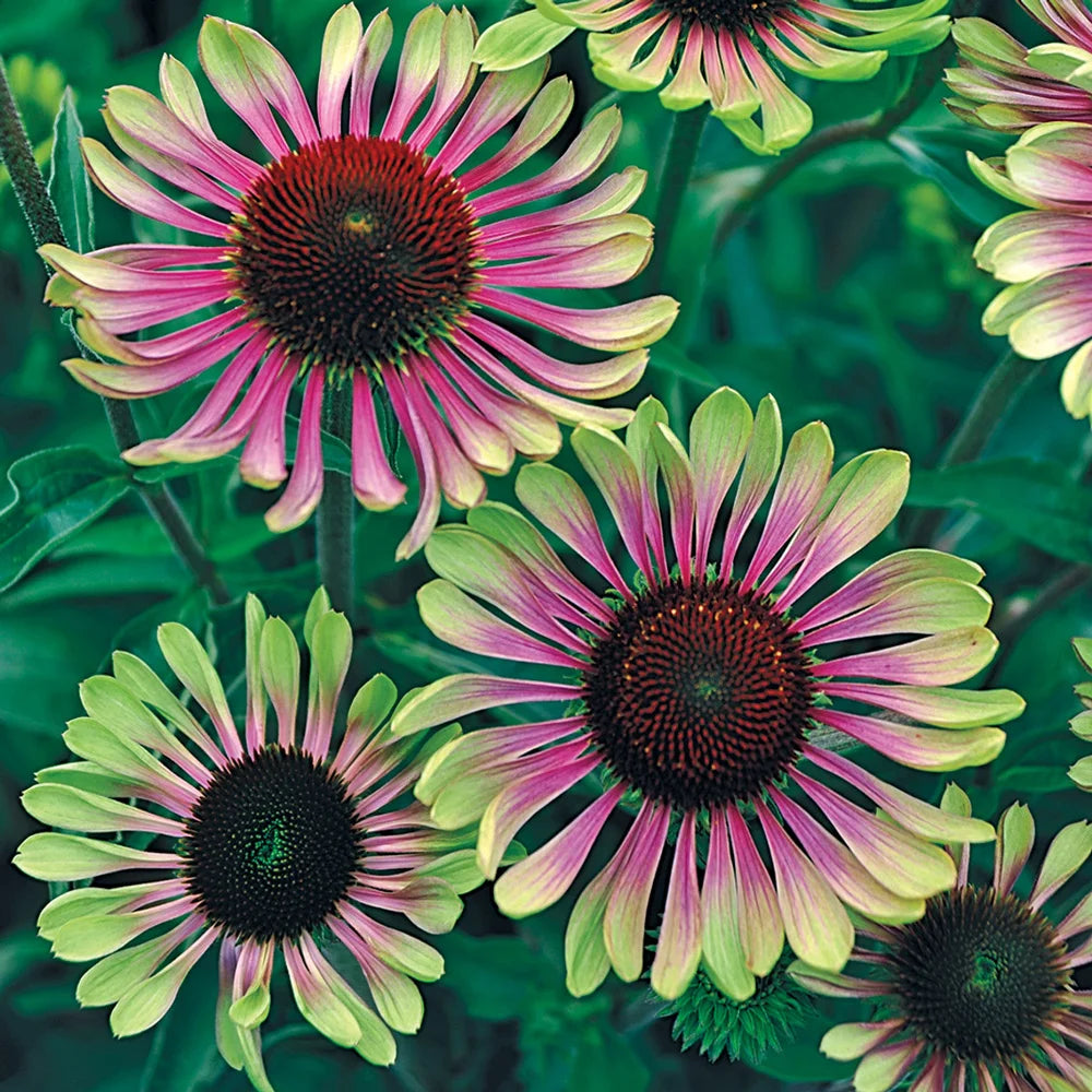 An eye-catching twist on the beloved coneflower, Green Twister's 4" light green flowers exhibit variations of yellow edging and carmine-red centers for one impressive effect in the garden. These easy-to-grow perennials are deer resistant and attract butterflies and bees. They're also excellent cut flowers.