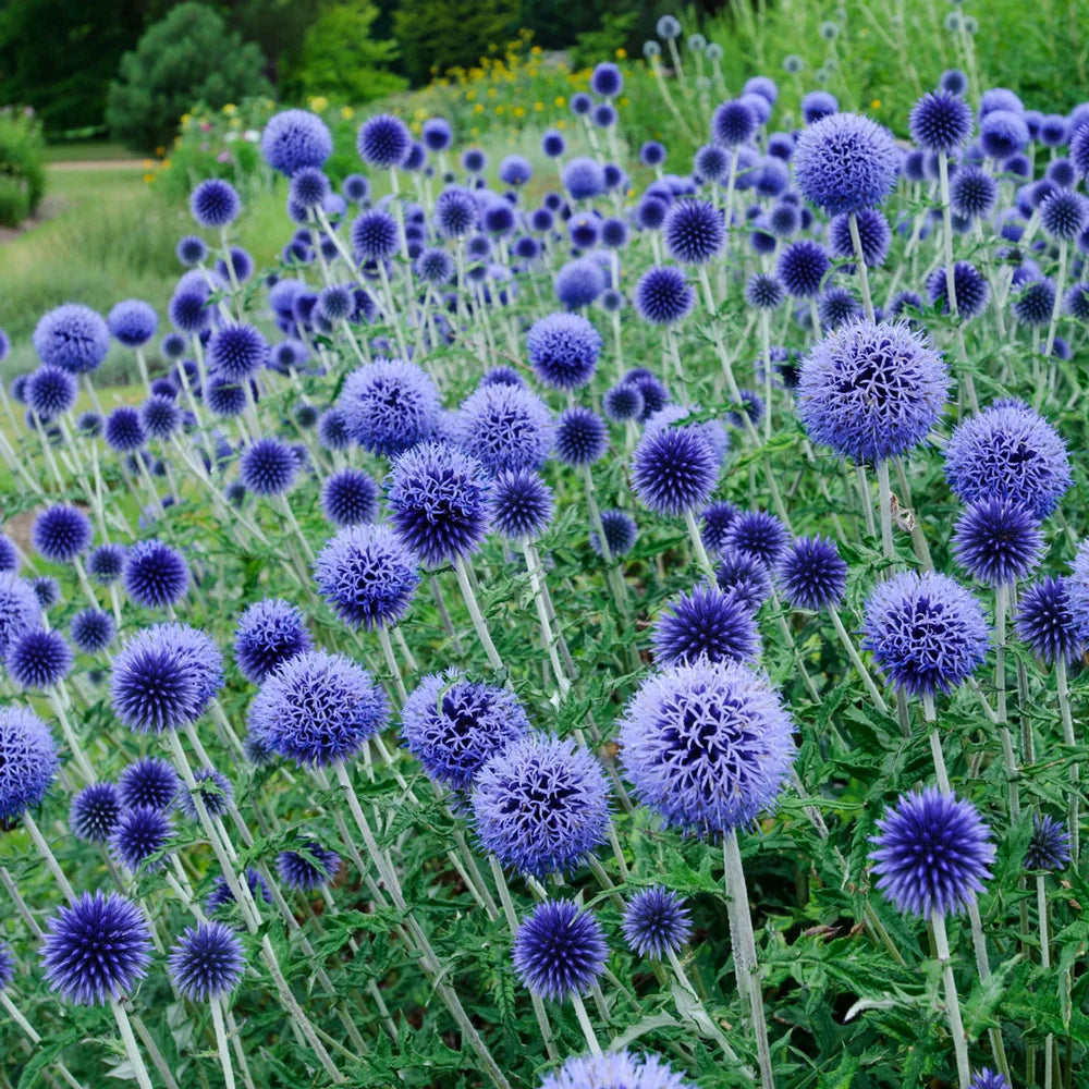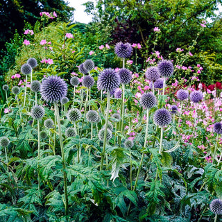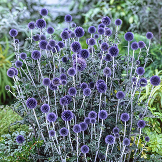 Gardeners and landscape pros that must contend with salty soil and drought conditions, this new offering is perfect for you! Introducing echinops ritro, an award-winning perennial that is as charming as it is carefree. Also known as Southern Globe Thistle, this unique plant is perfect for adding late-season color to borders, beds and even bouquets. Featuring small, metallic blue blooms that have a unique round flower form, echinops ritro is unlike anything most gardeners have ever seen. Its spiky, silver foliage adds an unusual twist to the overall look, especially when paired with more "traditional" summer perennials. These tough plants easily tolerate drought, high heat and salt. Pollinators love them!