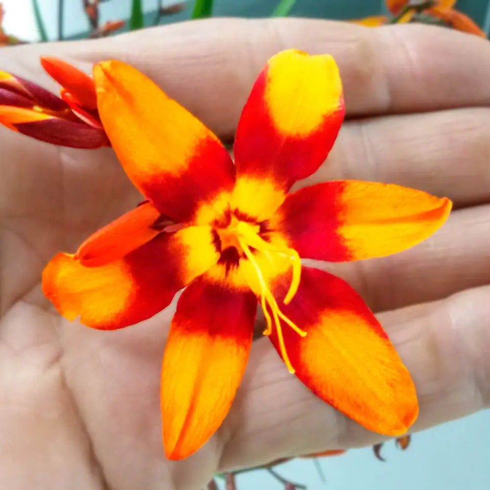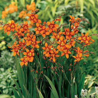 This large-flowered variety is a favorite for cut flowers. Emily McKenzie Crocosmia produces brilliant orange, tubular flowers accented with a red halo-like ring surrounding a yellow throat. Growing 30" tall, its wiry stems make it ideal for cut flowers. Crocosmia bloom in July-August and look best when planted in groups of 12 or more. The name comes from the Greek language and means "saffron smell," which reportedly can be detected when dried flowers are submerged in water. Plant in full sun to part shade among your perennials. Non-demanding bulbs will come back each year.