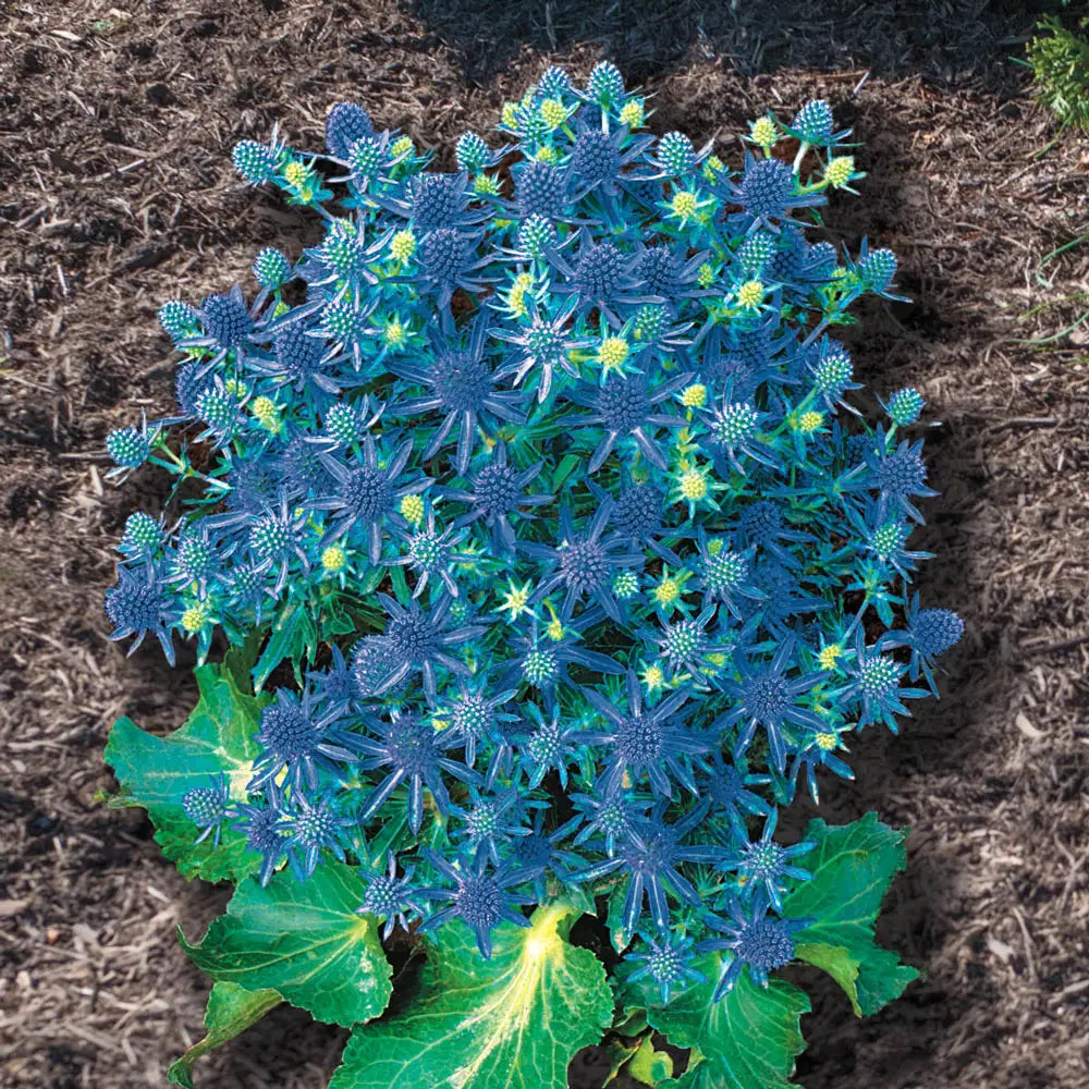 Customers living on the coast or in dry locales love the bold color and uniquely shaped flowers of Blue Hobbit Eryngium. Wherever you do business, a substantial planting of this unusual cultivar will turn heads and garner plenty of attention. Amazing steel-blue blooms cover dwarf, 10-12" tall plants with a reliable free-flowering habit for several months in summer. It is a wonderful choice for brightening up rock gardens, seasonal borders or mixed perennial arrangements (both fresh and dried). Blue Hobbit is dependably drought tolerant and highly attractive to butterflies and pollinators.
