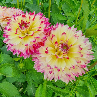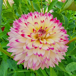 Named for the Greek goddess of love and beauty, this stunning fimbriata is one for the ages! Seldom offered dahlia features creamy white petals shaded in pale yellow and accented in bold pinkish-red. The centers boast a wonderfully deep purple glow that creates such a distinctive two-toned look in the garden, it is impossible to miss. Blooms are massive at 7-10" across and make excellent cut flowers. Aphrodite is a lovely variety for mid to back borders and even large containers. Be the first to offer this rare find!