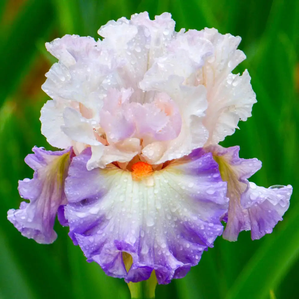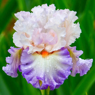 Three cheers for award-winning color and beauty! Not a recent introduction, but new to our iris lineup, Polite Applause deserves a big hand for its pale pink standards and luxuriant ruffled flower form. The falls are the same soft pink hue with a violet overlay and wide, violet margins. Tangerine beards give a contrasting pop of brightness. We like Polite Applause all lined up along a sunny path, near a foundation line or as a mid border addition.