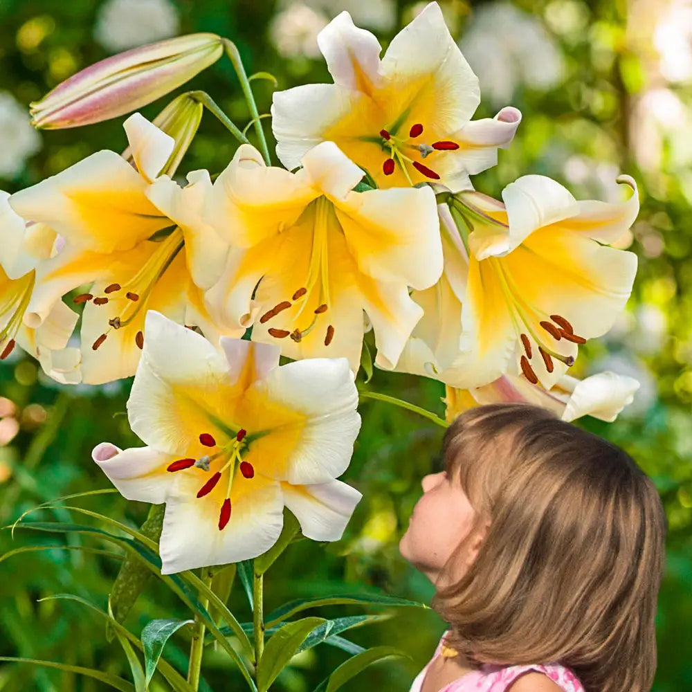 A luxuriant cross between Trumpet and Oriental lilies, this giant hybrid variety exhibits all the best qualities of both! Miss Peculiar is an exotic beauty that displays massive 11" blooms of icy white, each showing off a large orange-yellow center and elegant reflexed petals. Growing to an impressive height of up to 8' by its third year, it makes its mark in foundation plantings, along sunny fence lines or as a striking focal point in the landscape. Like others of its kind, Miss Peculiar produces multiple stems from a single bulb, which contributes to its stellar height. Pollinators are drawn to the fragrant, open blooms.