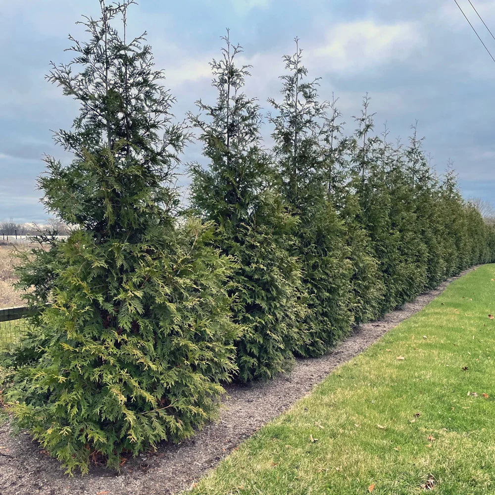 The Green Giant Thuja is a hybrid discovered in Denmark is a powerhouse performer, growing vigorously to towering heights. There's no need to prune this evergreen, you can simply let it grow its full 30-40' for a windbreak. The Green Giant arborvitae does respond well to pruning, however, if you'd prefer something a little more uniform for hedging. The biggest benefit, other than its brilliant size, is that the lush, abundant foliage puts the 'green' in evergreen—it won't turn yellow or bronze in winter. This Green Giant arborvitae hedge variety is not very picky about soil, but it prefers well-drained if you have it. It's also extremely resilient to hotter humid temperatures, as well as frost and snow. Order your Green Giant Thuja hedges, so you can have a beautiful, towering hedge that acts both as shade, a sound barrier, and privacy.