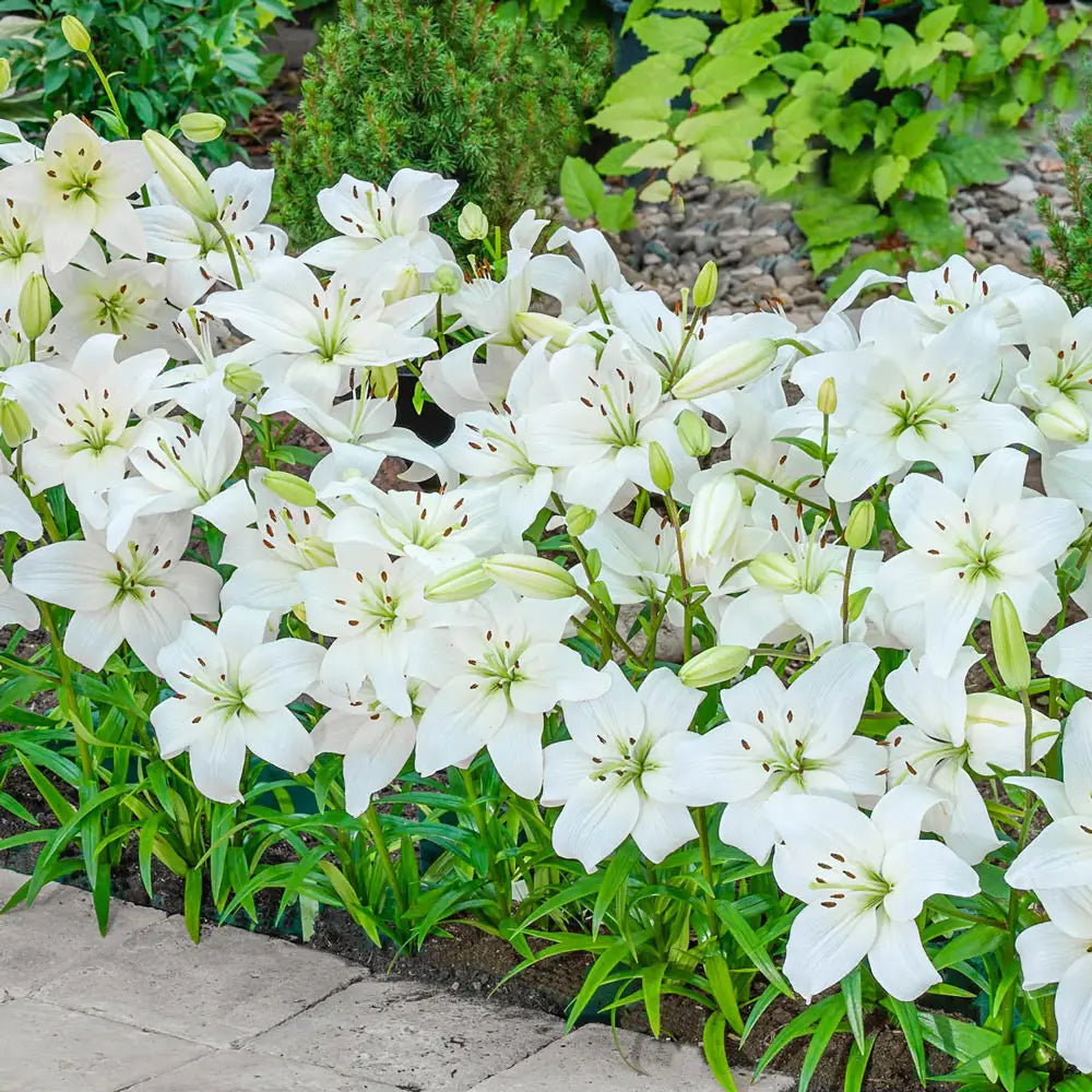Happy Ice may just be the perfect plant for edging walkways and prettying up decorative patio pots. This icy white border lily is tops for small or large spaces, adding grace and beauty wherever it is planted. Its distinct Asiatic lily form and bright white color make it an ideal addition to partly shaded sites or moonlight gardens. These cold hardy and dependable plants perennialize well, returning year after year. A moderate height gives these lilies staying power even through seasonal rains or high wind.