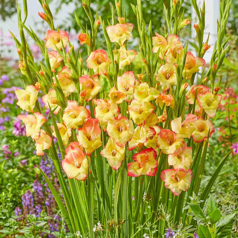 A fantastic hardy variety that is part of the primulinus group of glads, Las Vegas offers up loads of 3" soft yellow florets with red near the edges from mid to late summer. The blooms cover one side of the shorter 24" stems, and open together—10-12 at a time. The overall effect is quite striking in borders and beds; dramatic in smaller bouquets and arrangements. Pollinators and butterflies love Las Vegas, but who doesn’t? Withstands frost and is cold hardy in zones 6-9, zone 5 with good mulch coverage.