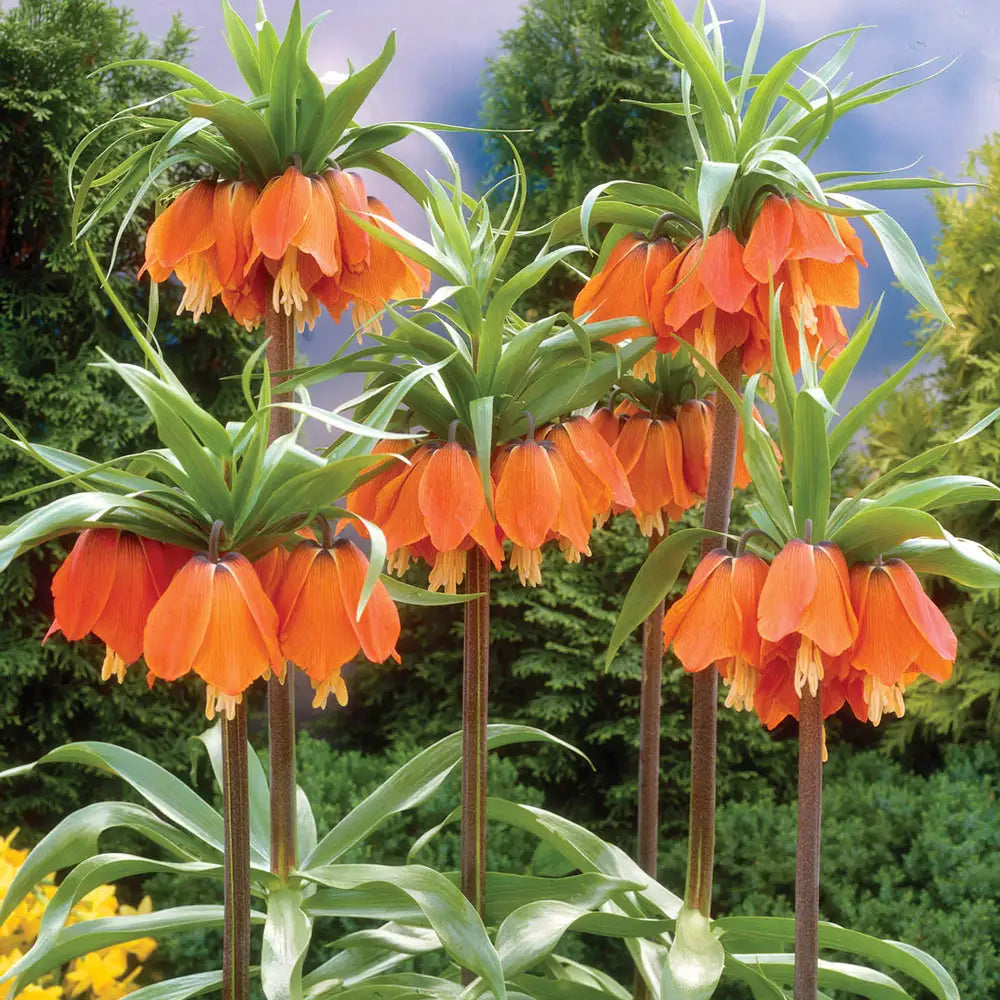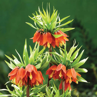 Clusters of fiery red, bell-shaped flowers opening atop 3-4' flower spikes make a statement in the mid spring garden. The flowers hang below a tuft of foliage, creating an exotic look. Fritillaria imperialis rubra (Red Crown), also called crown imperial, emits an odor that deer and squirrels don't like. The flowers attract pollinators. Frillaria imperialis grows best in full sun to partial shade and in well-drained soil. For an impressive look, plant in clumps in the back border. It can also be planted in containers.