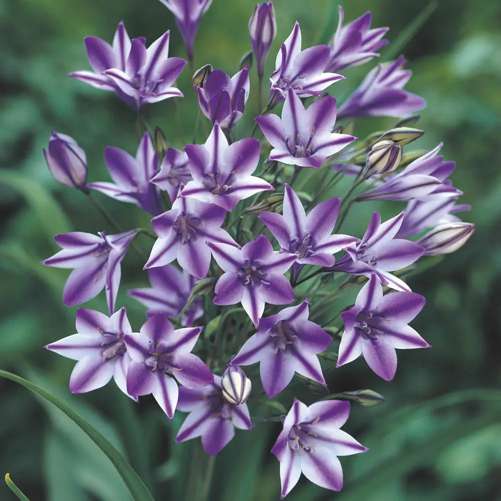 A rare find in the U.S., Ithuriel's Spear Rudy is quite popular in the Netherlands, and is widely used as a charming cut flower. Clusters of 12-15 small, white blooms expertly striped in a cheerful violet-blue hue, top wiry stems, creating a winsome display perfect for borders, naturalized sites and cutting gardens. Easy to grow and highly attractive to pollinators and butterflies, it should be a top choice for bee-friendly landscapes.