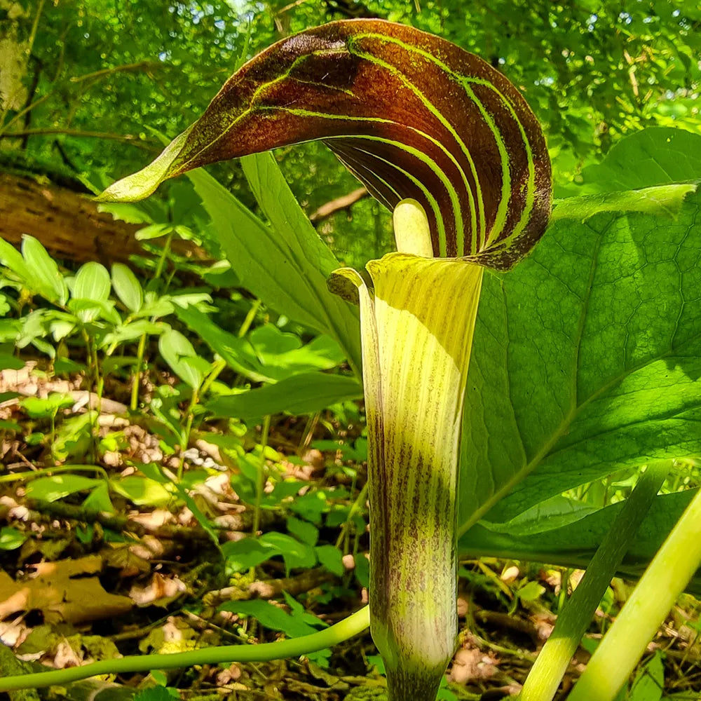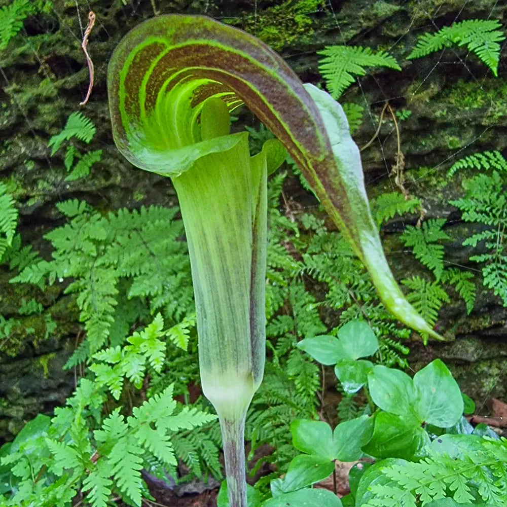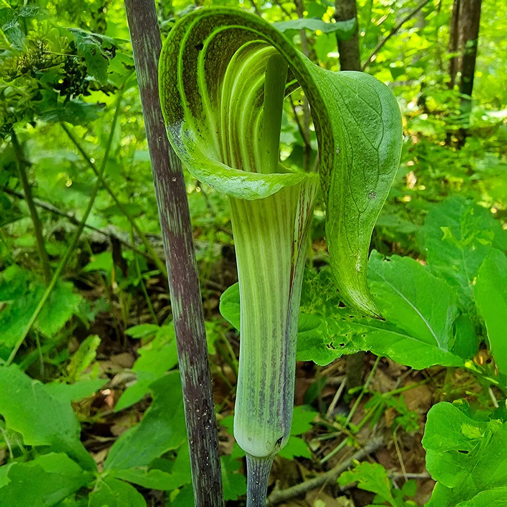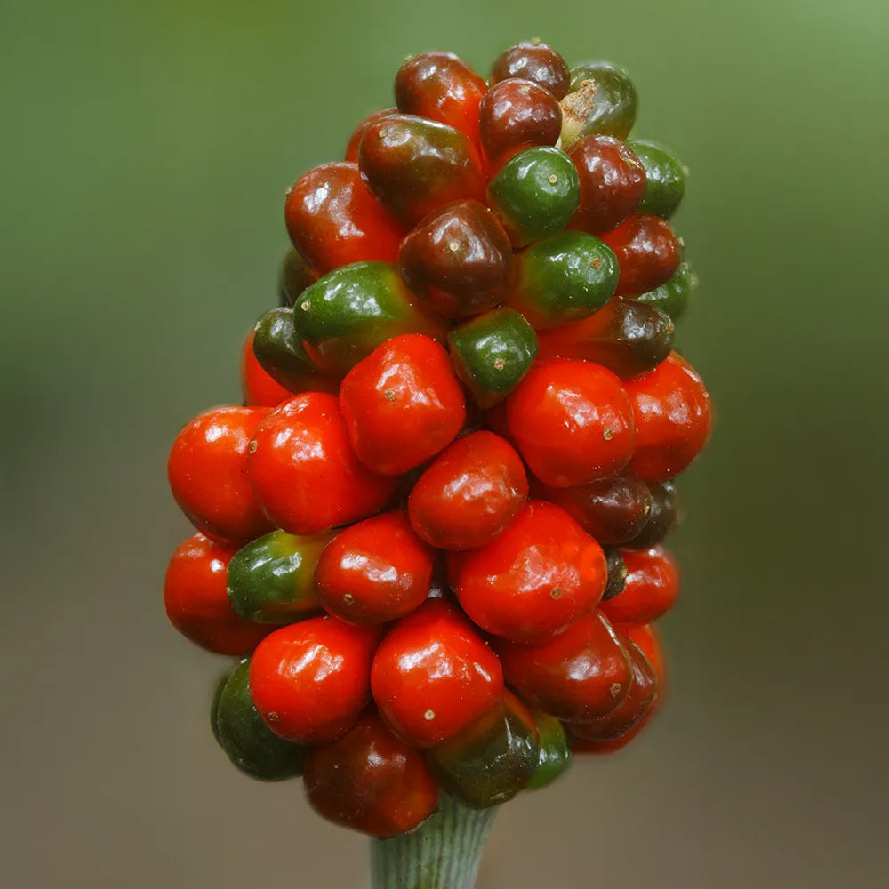 Offering three seasons of unique color, form and beauty, our native Jack in the Pulpit is a fantastic addition to shade gardens and woodland sites. A favorite of passing pollinators and butterflies over a long period, it is a true three-season plant. Unusual flower spathes are variable in color, ranging from mid green to purple striped, and appear in late spring. The crisp temperatures of autumn bring clusters of fiery red berries that stand out against the muted tones of that season. Native of the US.