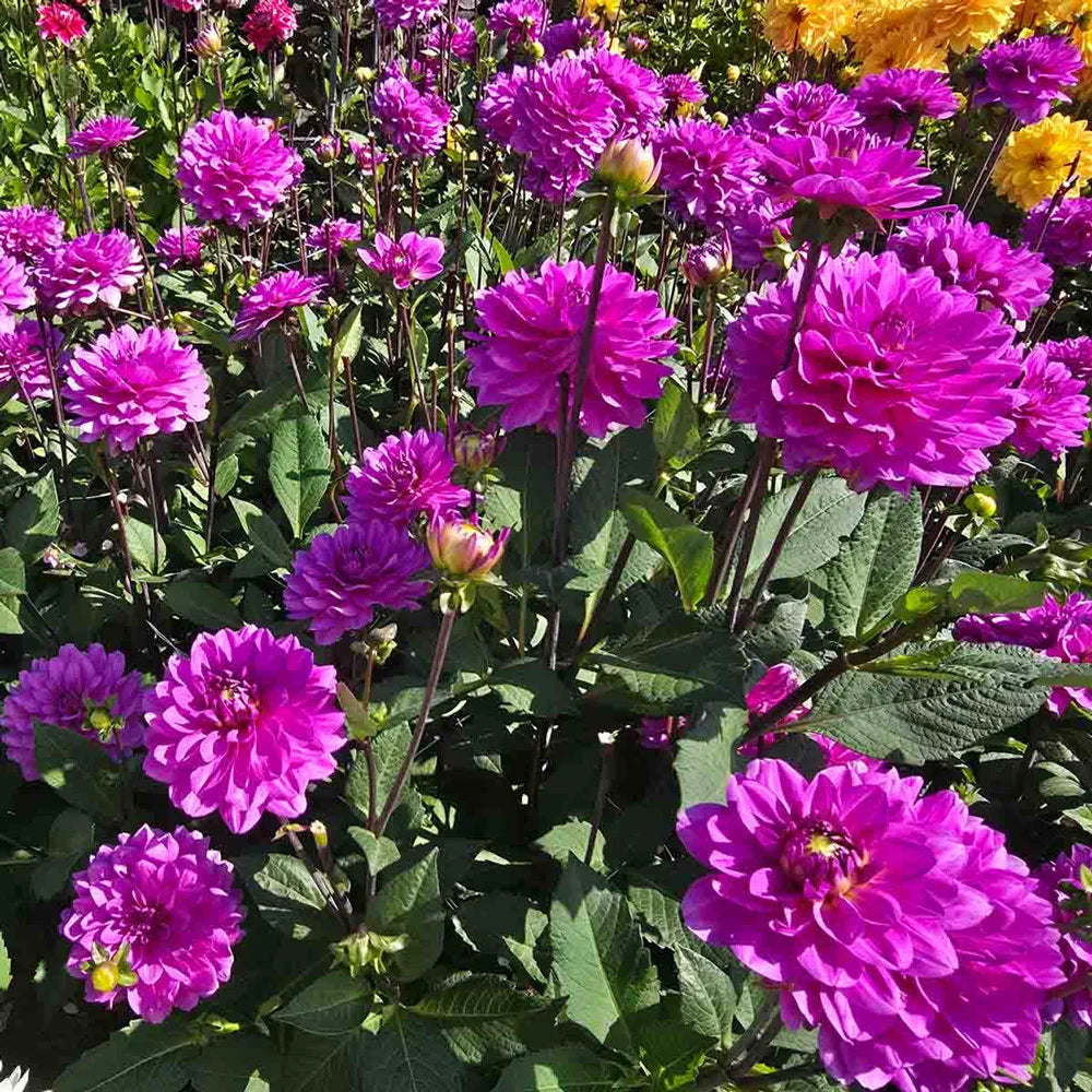 Large, purple-blue flowers make eye-catching bouquets and fresh floral arrangements. Karma dahlias were developed for the cut-flower market in Holland and are known for their extraordinarily strong stems and almost iridescent colors. We first came across this new series of dahlias while visiting the Verwer Brothers a few years ago in their trial gardens and were captivated.  Karma Dahlia Lagoon's fully double flowers measure up to 5 1/2" across and the color is phenomenal. Growing 32" tall, the plants produce plenty of blooms in midsummer and keep flowering until the first fall frost.