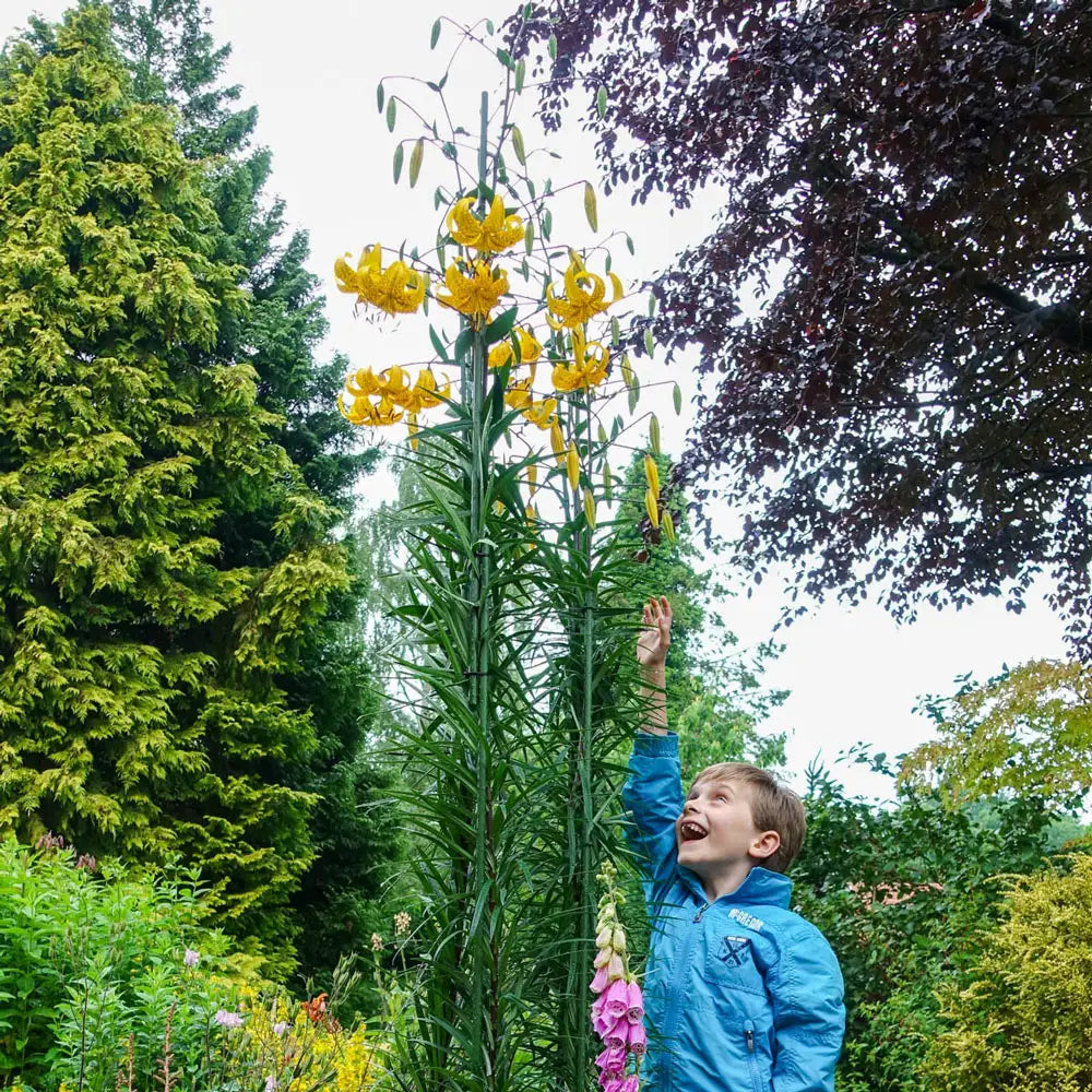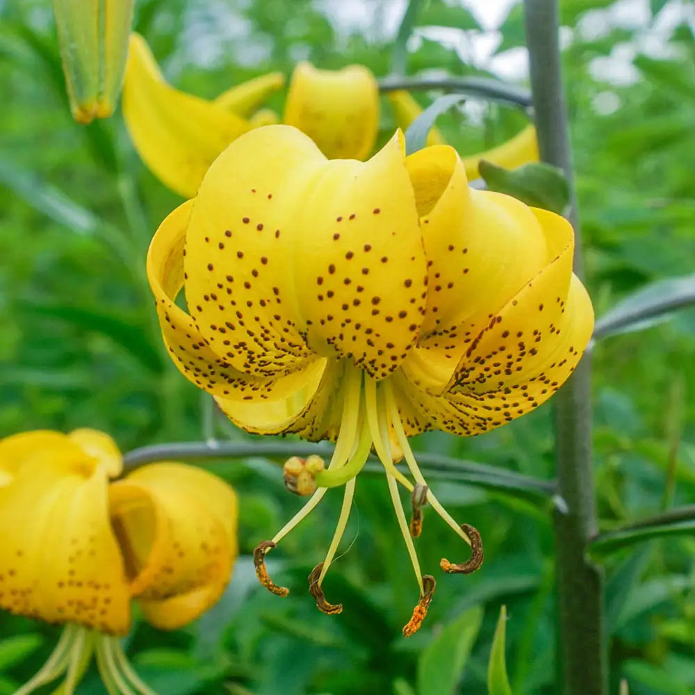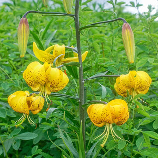 Gardeners and lily aficionados alike adore this Japanese native lily. Lilium leichtlinii produces up to 20 yellow, recurved blooms per stem. The 2" flowers feature purplish-maroon freckles and closely resemble exotic tiger lilies. The graceful plants are very fast growing and will reach up to 7 feet tall in just a few years. Flowers face downward so you get a good look from below. Adds amazing color and striking good looks to back borders, focal point plantings and rustic fence lines.