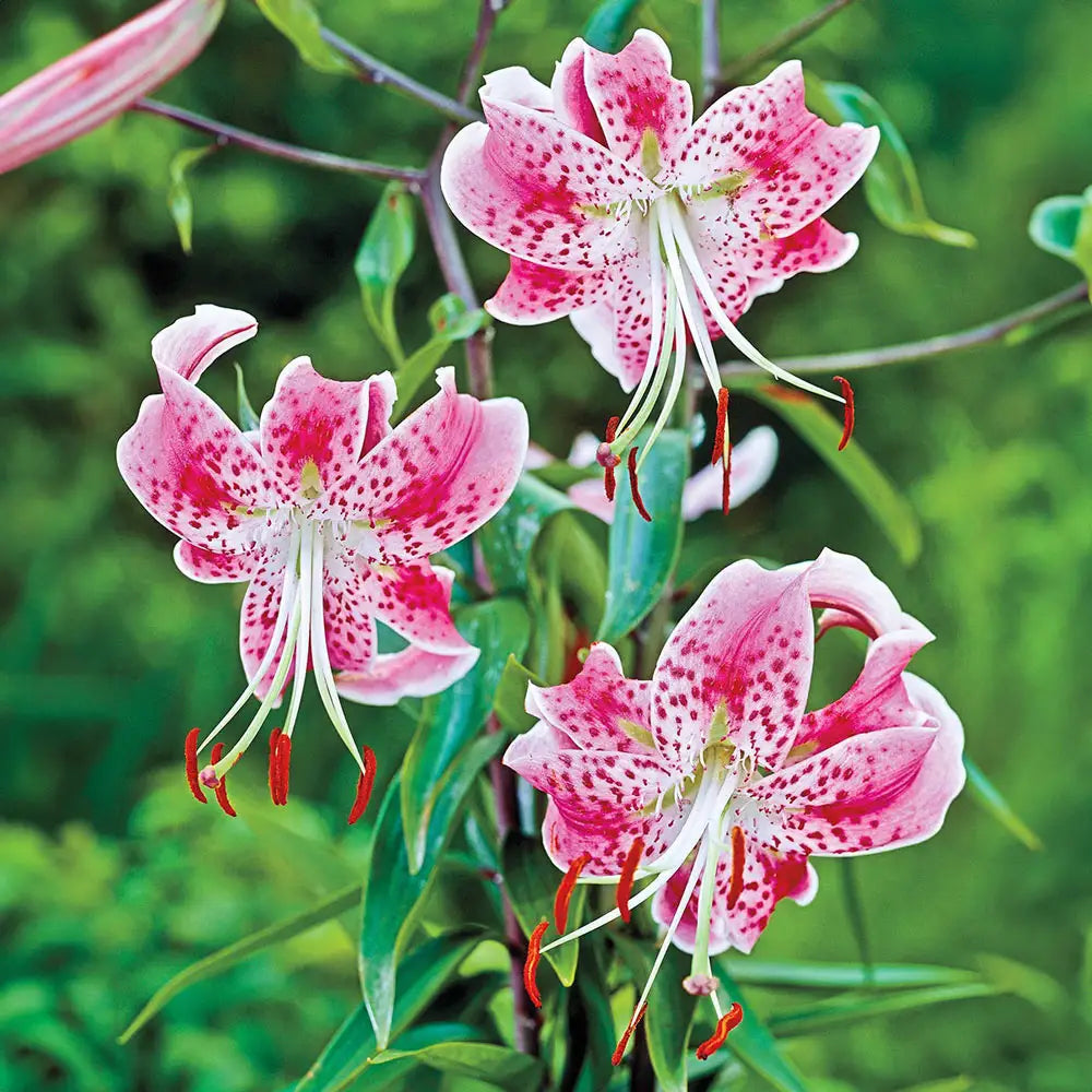 For a floral display with style, beauty and color, a generous planting of Uchida Lily is always a hit. Down-facing, warm pink blooms edged in white and speckled in darker pink create an eye-catching show in borders, feature beds and cutting gardens. The fragrant, deeply recurved blooms are wonderfully long lived in the garden and very hardy. Pollinators such as butterflies are drawn to their soft scent and will likely be regular visitors to the landscape. Showy yet very easy to grow.