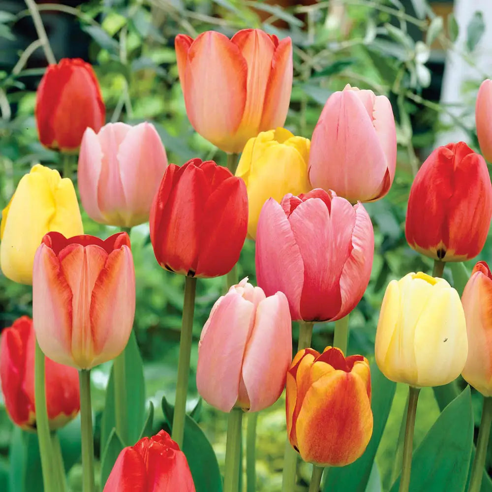 (Darwin Hybrid Tulips) An affordable way to plant lots of Tulips! A mix in a variety of reds, pinks, yellows and bicolors. This class of Tulips flowers year after year! Excellent for perennializing!